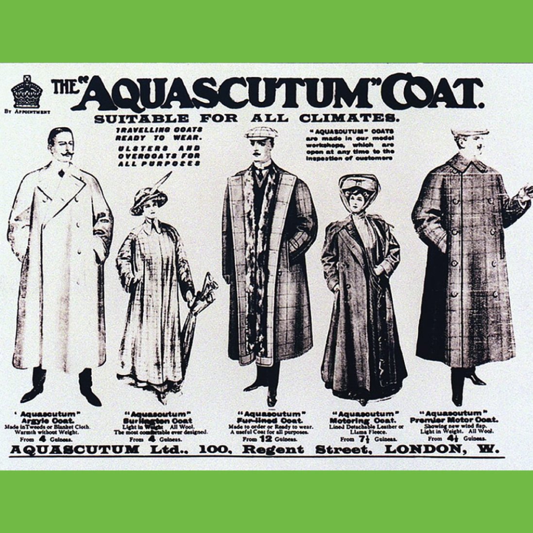 この技術は、雨の多いイギリスの気候に最適なアウターとして瞬く間に評判を呼び、ブランド名はラテン語で「水(aqua)」と「盾(scutum)」を組み合わせた「水の盾=アクアスキュータム」と名付けられました。