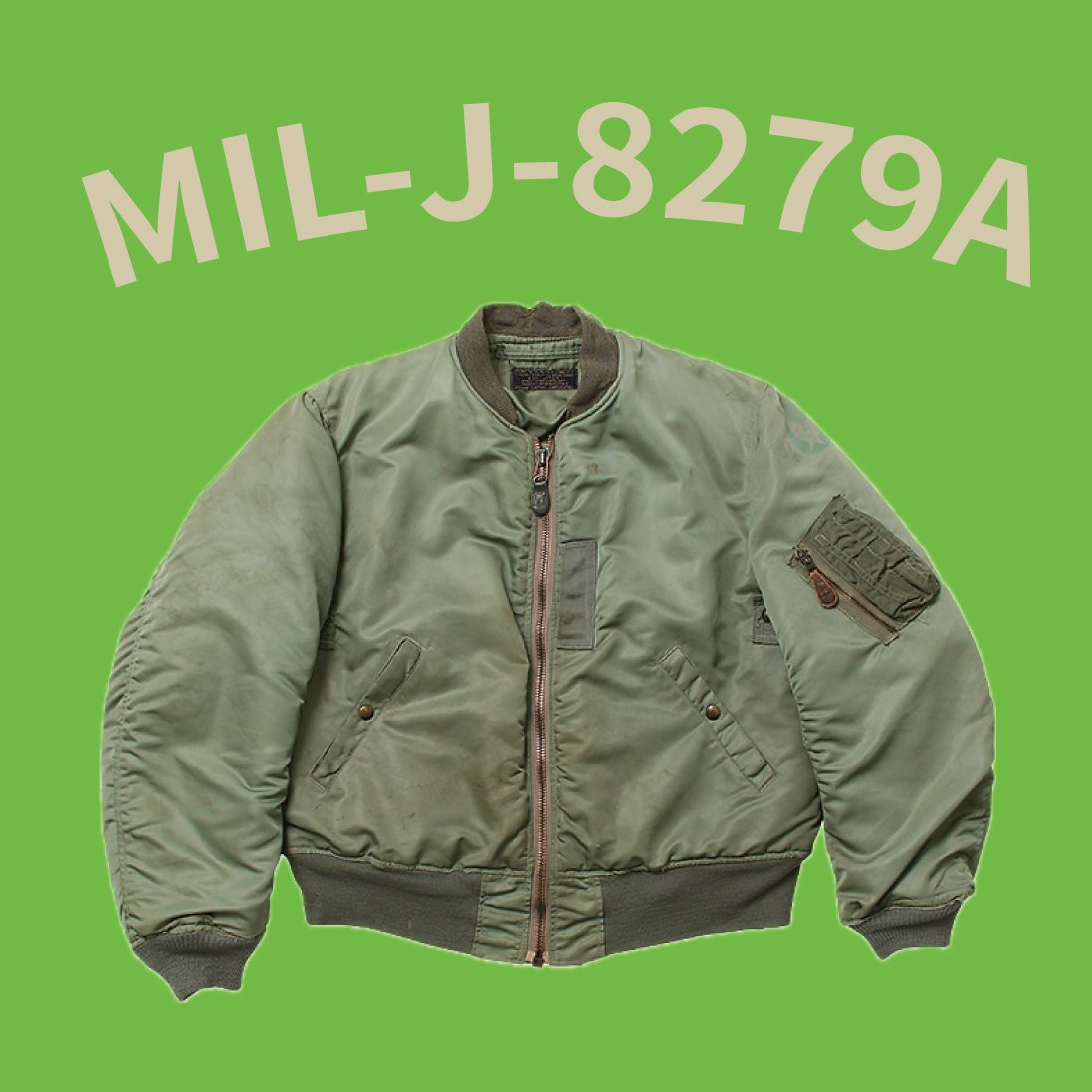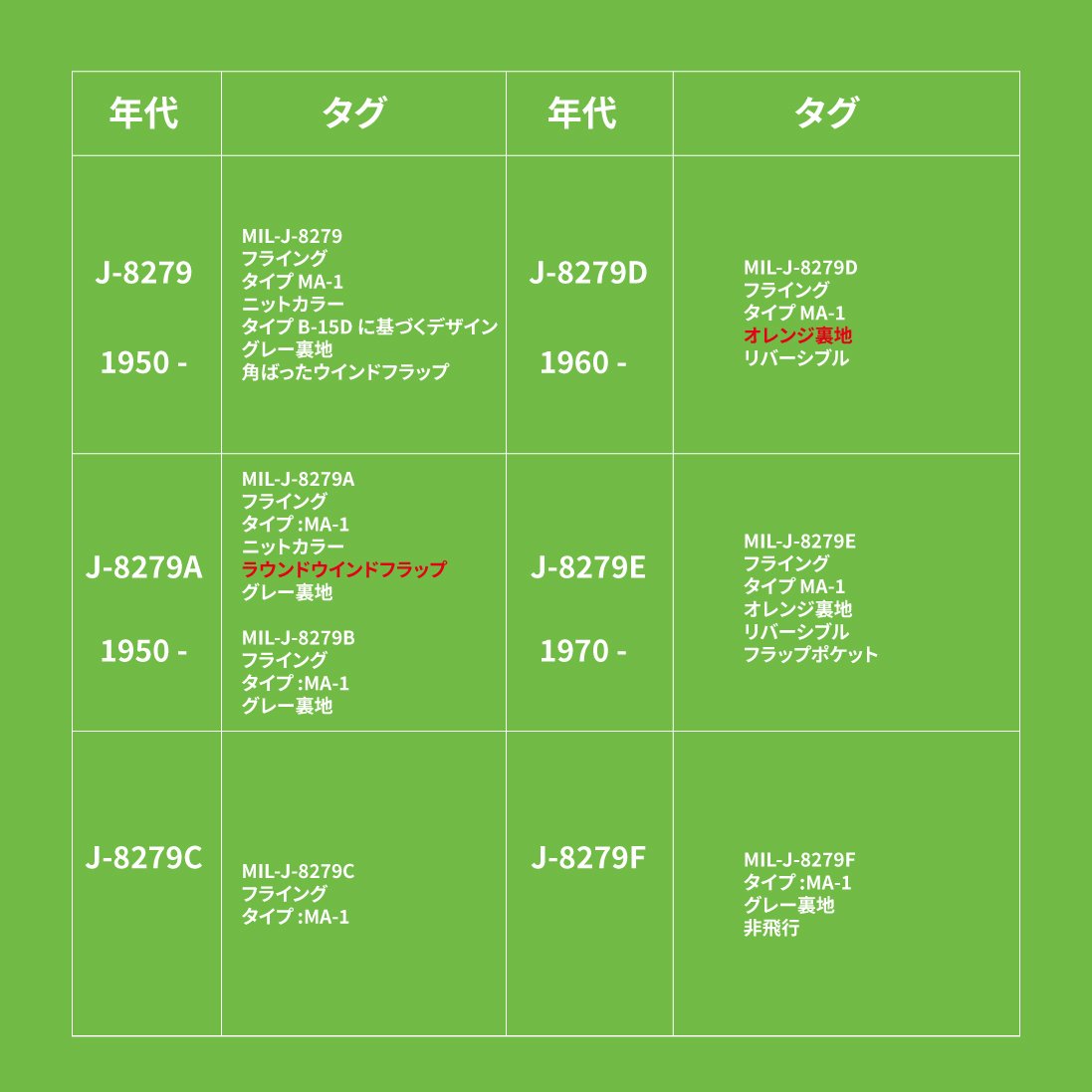 MIL-SPEC(ミルスペック): MA-1の正式な軍用規格番号で、「MIL-J-8279」に続くアルファベットで年代が分かります。