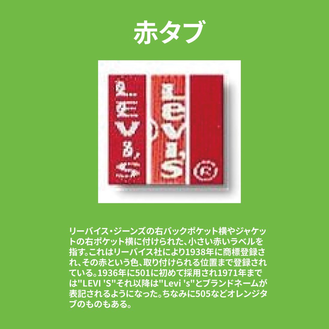 リーバイスのジーンズやジャケットのバックポケット、あるいは胸ポケットの横に付けられた小さな赤いラベルのことです。これは1938年にリーバイス社によって商標登録され、その色や取り付け位置までもが保護されています。1936年に「501」モデルに初めて採用されました。