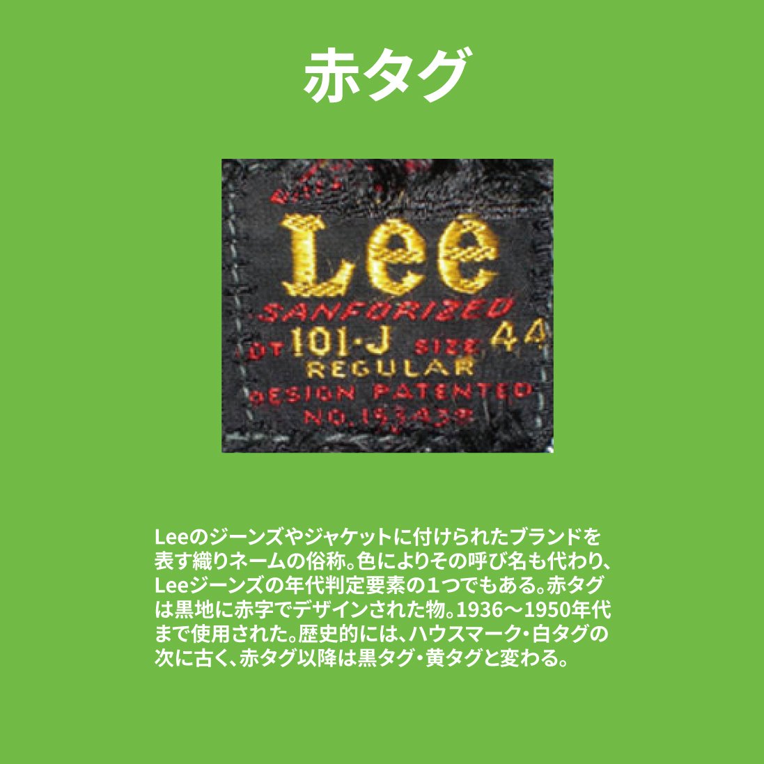 これは主にLee (リー) のジーンズやジャケットに付けられた、ブランドを表す織りネームの俗称です。赤地に黒字でデザインされていることからこう呼ばれます。1936年から1950年代まで使用されたとされ、リーバイスの赤タブとは異なります。リーのジーンズの年代を判別する重要な要素の一つで、赤タグの前にはハウスマークや白タグがあり、後には黒タグや黄タグへと変わっていきます。
