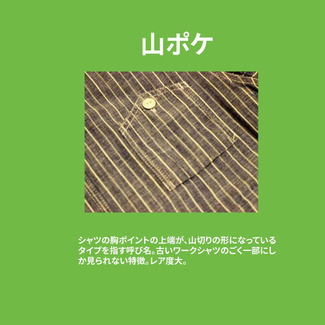 シャツの胸ポケットの上端が、山のように尖った逆三角形になっているデザインのポケットです。主に古いLeeのワークシャツにごく一部見られる特徴であり、非常にレアなディテールとして知られています。