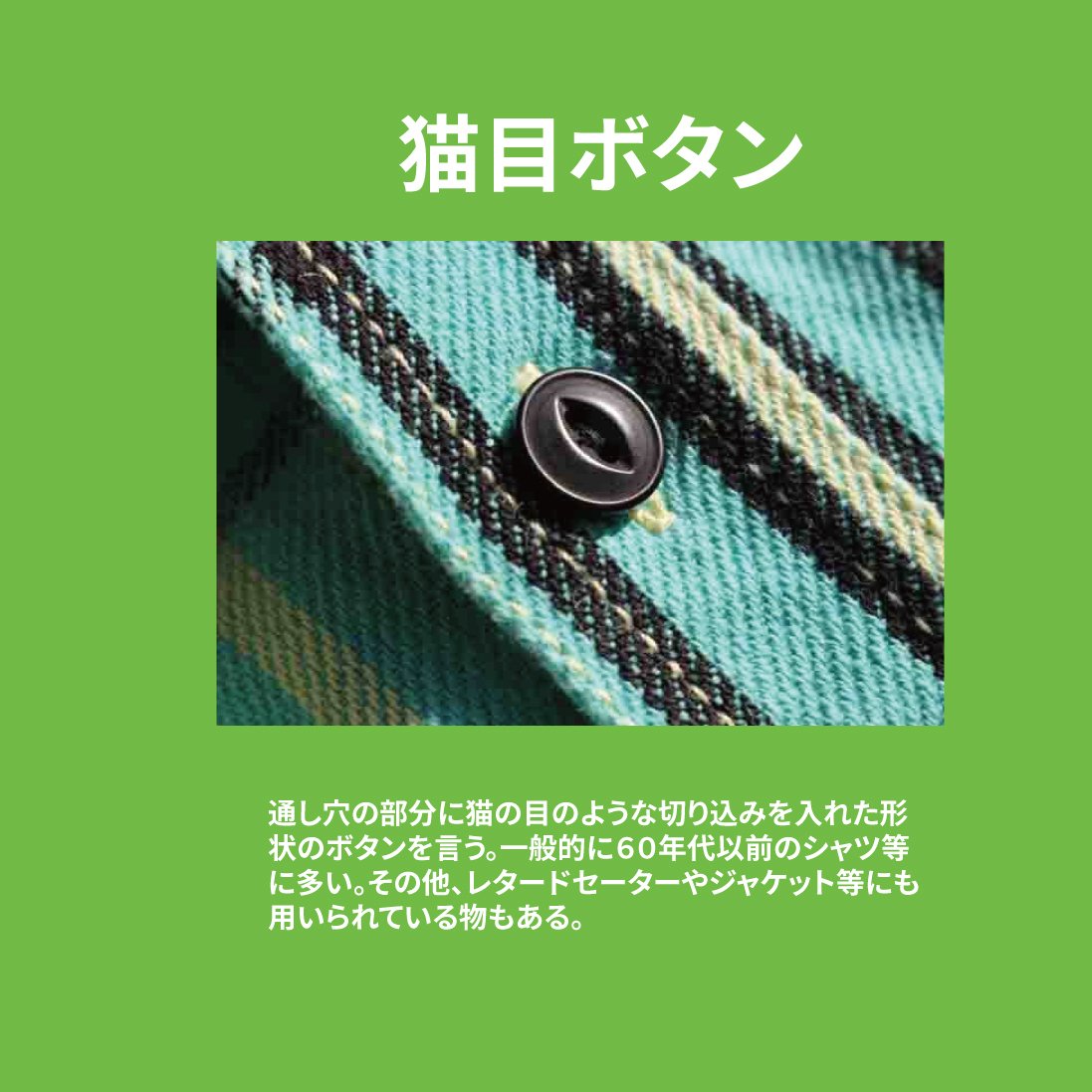 ボタンの中心に、猫の目のようにくぼんだ切り込みが入った形状のボタンです。一般的に1960年代以前のシャツやワークジャケット、カバーオールなどに多く見られます。尿素樹脂などの素材で作られており、古い年代のワークウェアに独特の風合いを与えています。