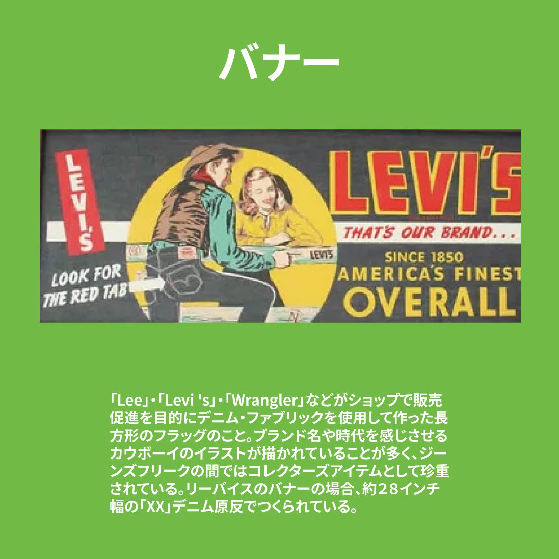 「旗」を意味する言葉で、ヴィンテージデニムの世界ではLee、Levi's、Wranglerなどのブランドがショップの販促を目的にデニム生地で作った長方形のフラッグを指します。ブランド名やカウボーイのイラストなどが描かれており、年代を感じさせるデザインが特徴です。ジーンズ愛好家の間では貴重なコレクターズアイテムとして珍重されており、特にリーバイスのバナーは「XX」デニムの原反で作られていることもあり、希少価値が高くなっています。