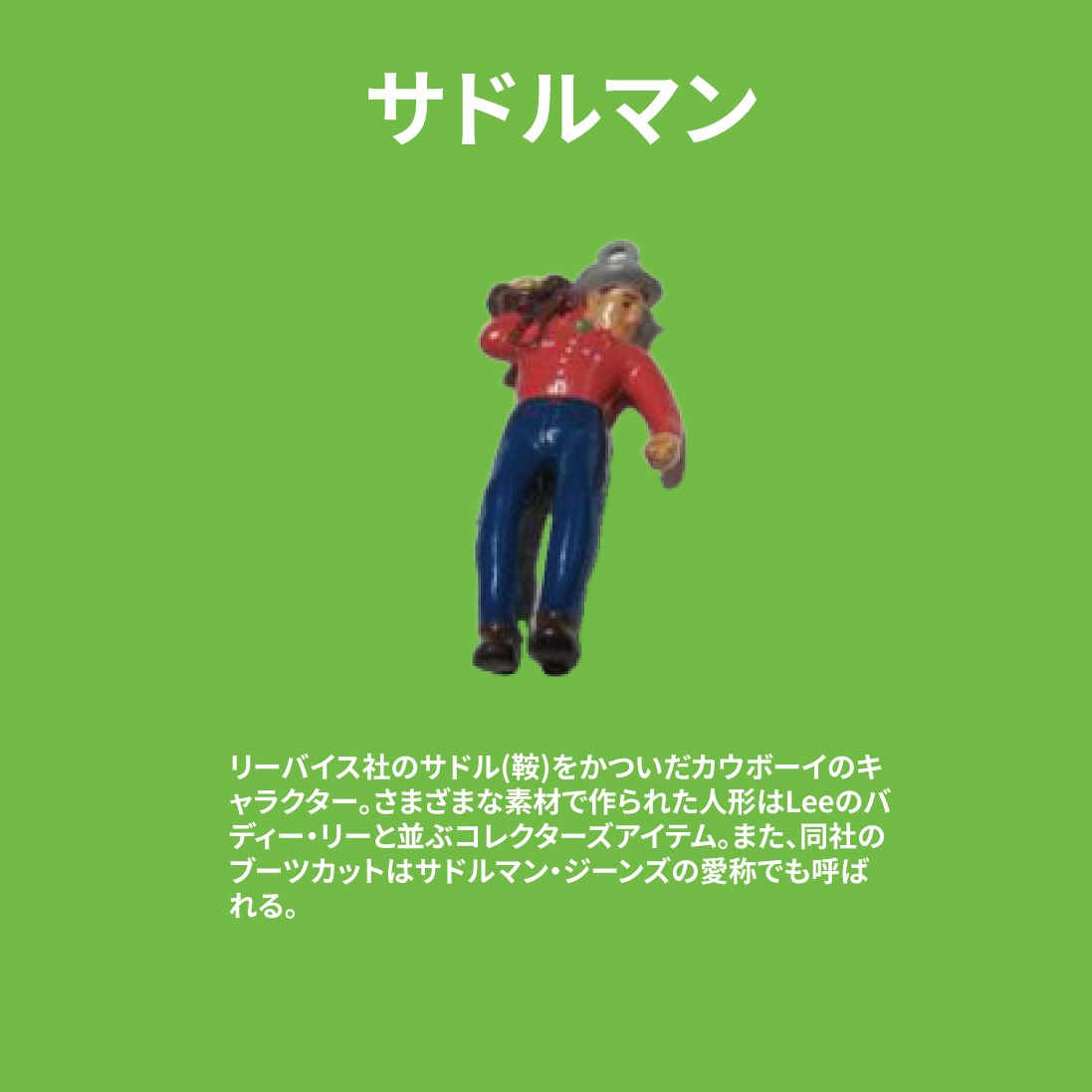 サドルマンは、リーバイスのジーンズに登場するカウボーイのキャラクターのこと。鞍(サドル)を担いでいる姿からこの名前がついています。1950年代の広告などでよく見られ、Leeのバディー・リー人形と並ぶコレクターズアイテムです。特にリーバイスのブーツカットジーンズは、「サドルマン・ジーンズ」とも呼ばれていました。