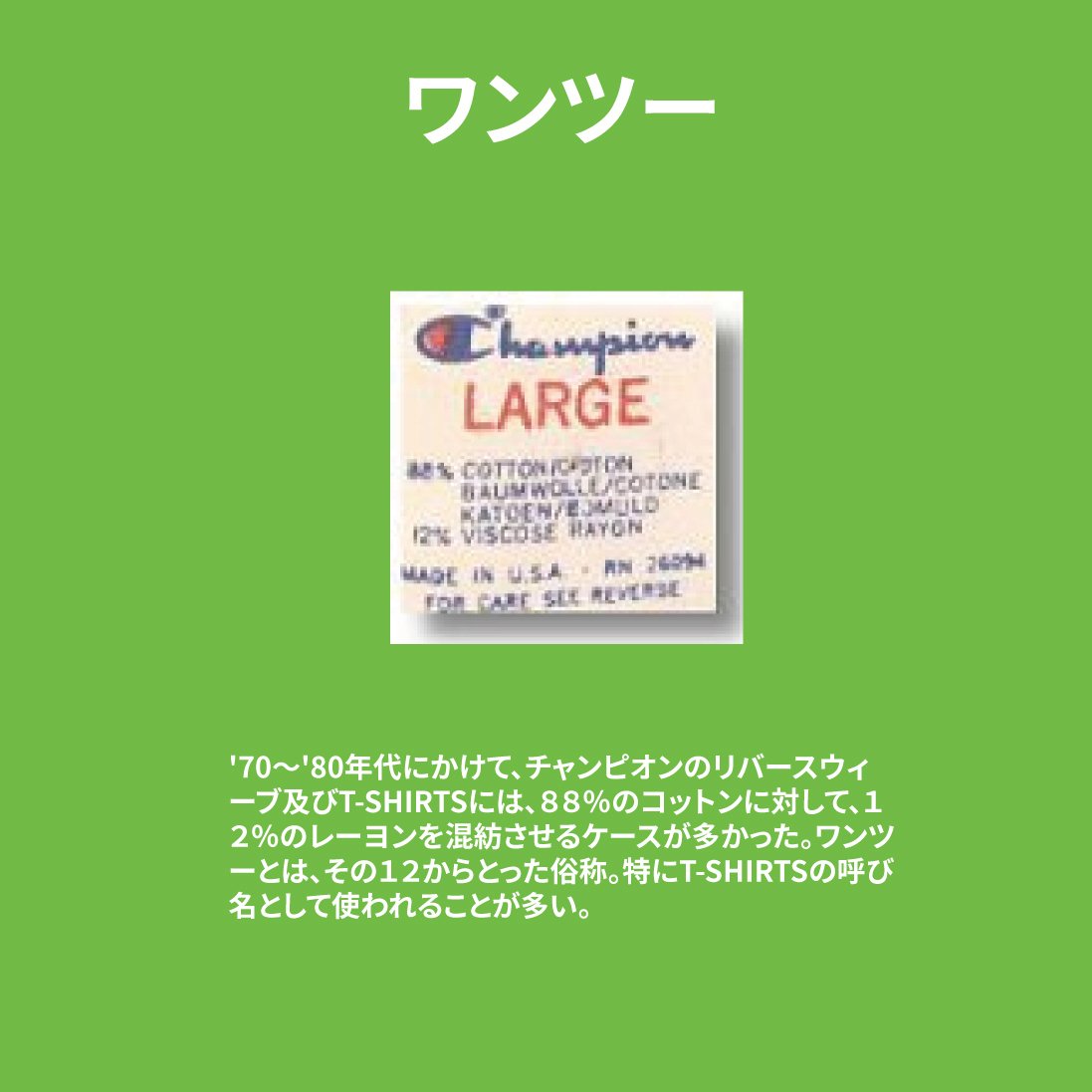 ヴィンテージのチャンピオンTシャツでよく耳にするのが「ワンツー」。これは、生地の素材が綿88%とレーヨン12%でできていることからそう呼ばれています。この比率から「ハチハチイチニ」とも言われ、やわらかい肌触りとしっかりとした生地感が特徴。古着好きの間では、特に人気が高いTシャツのボディです。