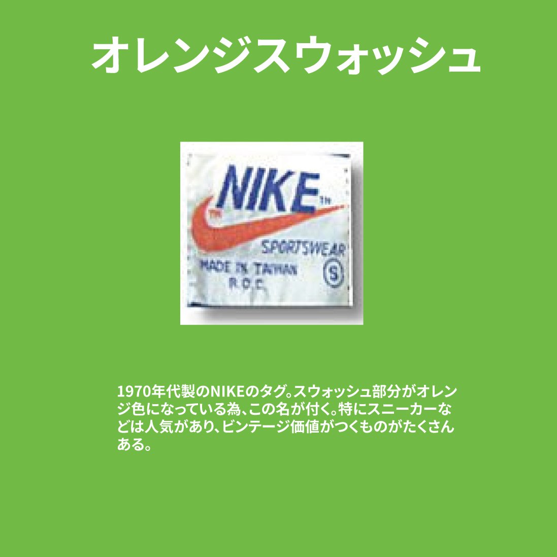 ナイキのヴィンテージアイテムを探している人なら、一度は聞いたことがあるはずの「オレンジスウッシュ」。これは、1970年代のナイキのタグに描かれている、筆記体の「NIKE」ロゴとオレンジ色のスウッシュ(ロゴマーク)を指します。通称「オレンジタグ」とも呼ばれ、NIKEのヴィンテージの中でも特に希少価値が高いとされています。