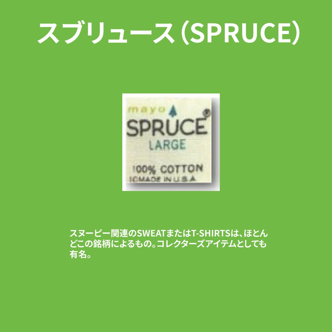 スヌーピーのヴィンテージTシャツの中でも、特に人気なのが「スプルース」製のもの。これは、1960年代にスプルース社が製造していたスウェットやTシャツのブランドで、ピーナッツのプリントアイテムを数多く手掛けていました。古着市場では、スプルース社製のスヌーピーTシャツは、コレクターズアイテムとして非常に人気があります。