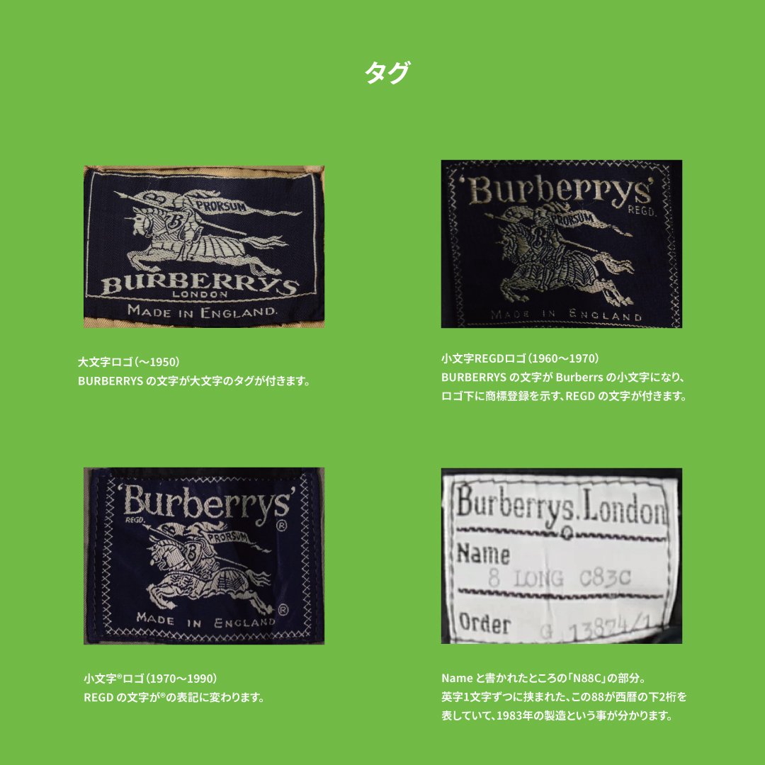ヴィンテージバーバリーの魅力の一つが、タグのデザインからその年代を推測できることです。主要なタグを時系列で見ていきましょう。