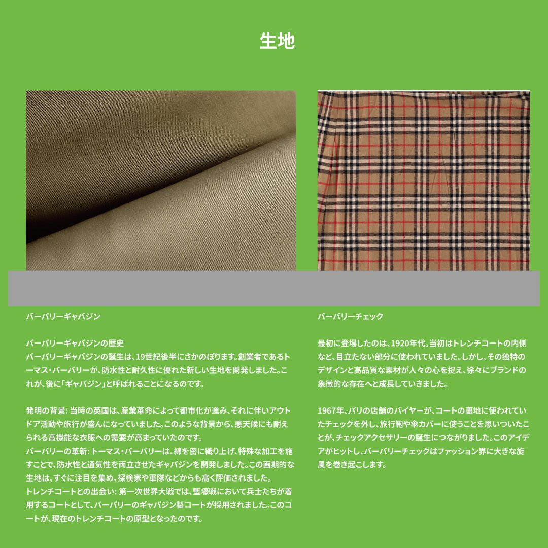 バーバリーの代名詞である「ギャバジン」は、目が詰まった緻密な綾織りで、高い耐久性と撥水性を誇ります。天然素材であるコットン100%でありながら、しっかりと水を弾き、通気性も確保しているのが特徴です。また、独特の光沢感があり、上品な風合いを醸し出しています。