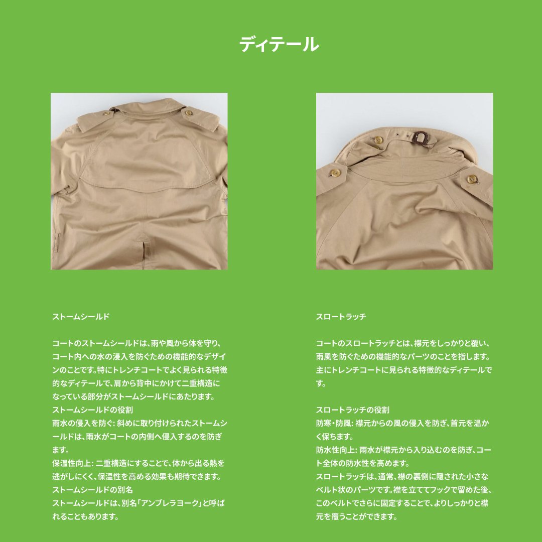 トレンチコートには、軍用コートの名残である機能的なディテールが満載です。