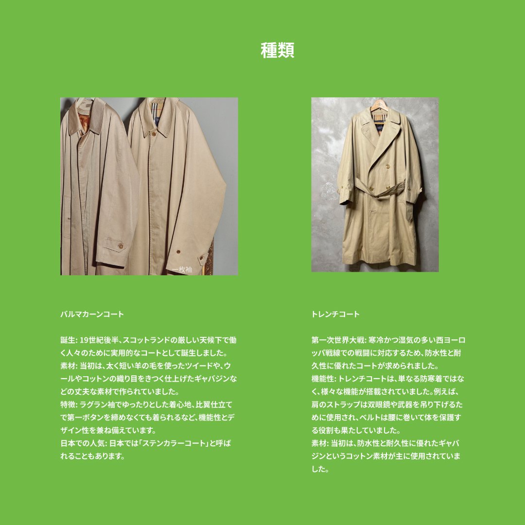 その他にも、トレンチコートの前身である「タイロッケンコート」や、シンプルなデザインが特徴の「ステンカラーコート(バルマカーンコート)」など、多種多様なコートが展開されています。