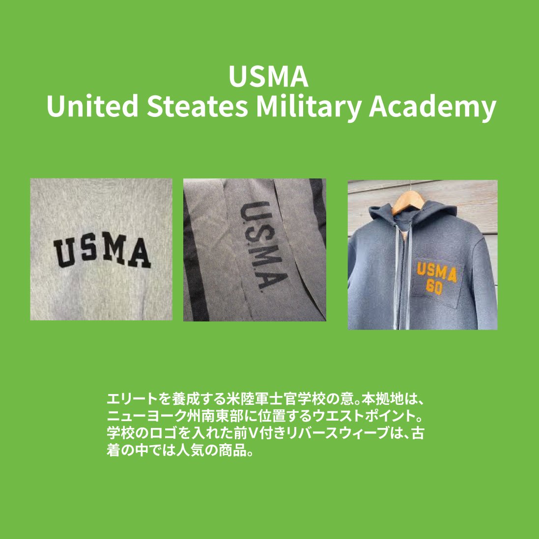 カレッジロゴのように「USMA」の文字や紋章が入ったスウェットやTシャツ、ジャケットは、どこかアカデミックで知的な雰囲気が漂うのが魅力。ブレザーや制服も古着として人気が高いアイテムです。