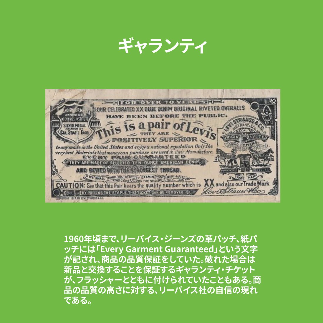 まずご紹介するのは、ワークウェアの胸元やポケットに縫い付けられていることの多い**「ギャランティチケット」**。これは、その名の通り「品質保証書」の役割を果たしていました。