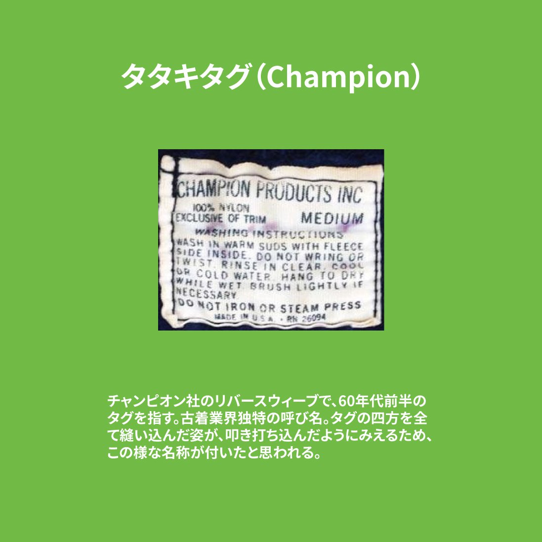 続いては、主にスウェットやTシャツのネック部分に見られる**「たたきタグ」**。これは、タグの四方を長方形を描くように、力強くステッチで叩きつけていることからその名が付きました。