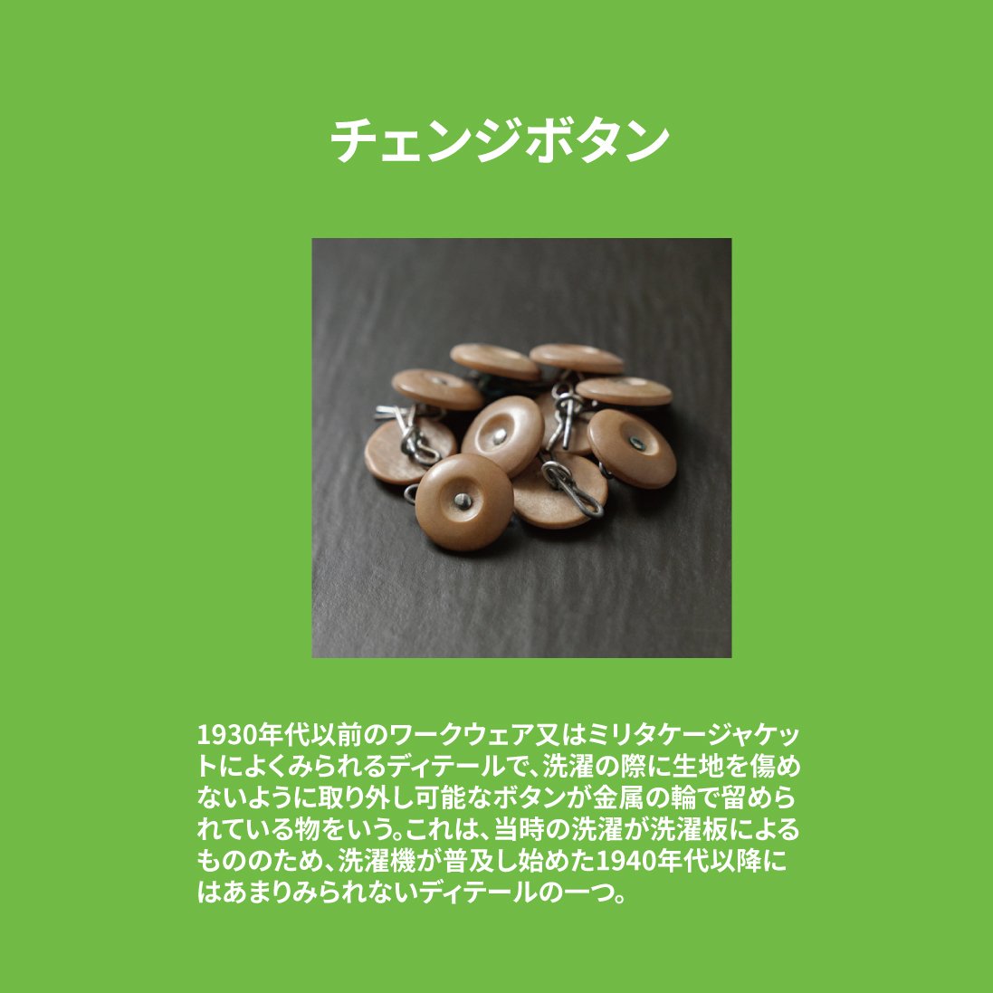 **「チェンジボタン」**は、主に1930年代頃までのワークジャケットやカバーオールに見られる、取り外し可能なボタンのことです。
