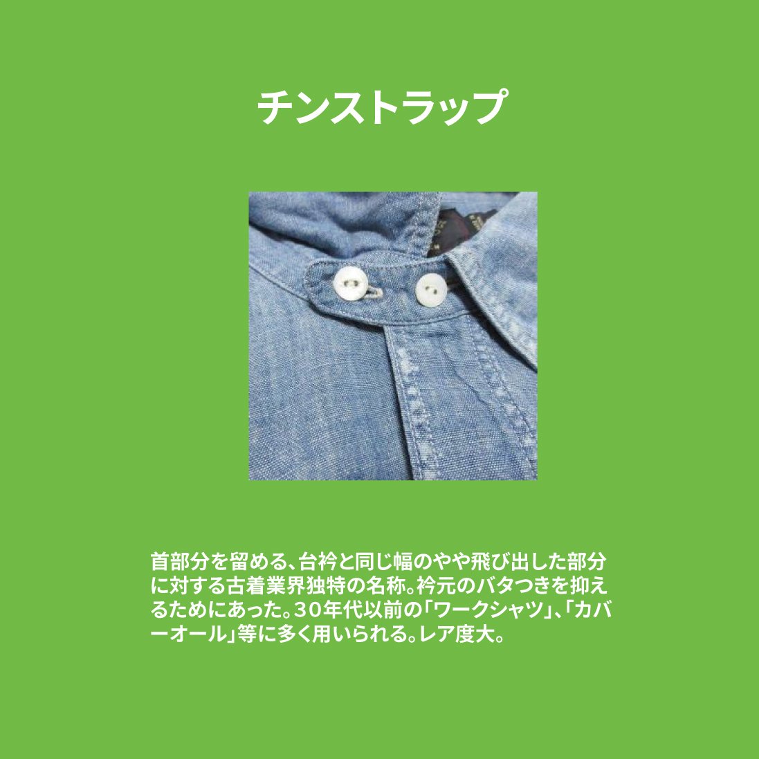 最後は、シャツの襟元に付いた小さな帯**「チンストラップ」**(通称:チンスト)が付いたシャツです。