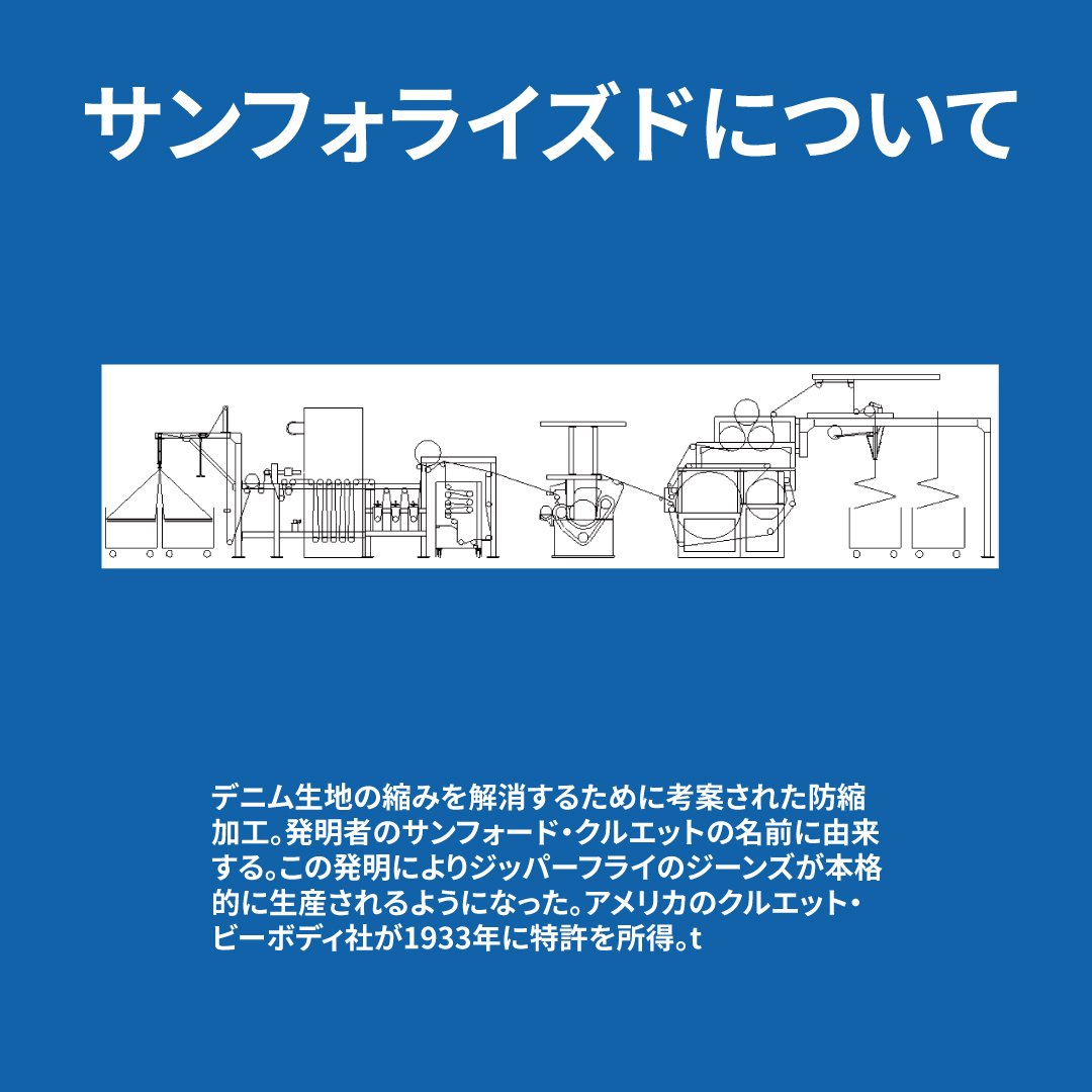 サンフォライズとは、デニム生地の段階で特殊な加工を施し、洗濯による縮みをあらかじめ防ぐ「防縮加工」のこと。 発明者であるサンフォード・クルエット氏の名前に由来します。