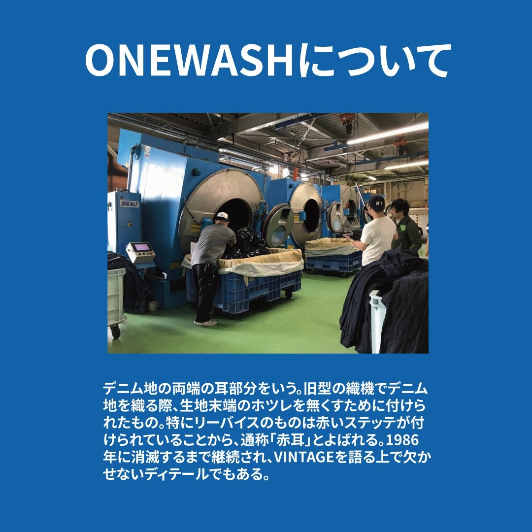 最終工程は、**ONEWASH(ワンウォッシュ)**です。これは、デニムを一度水に通して、糊(のり)を落とし、生地を縮ませる作業です。