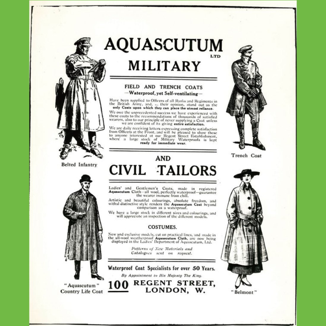 トレンチコートの原点: 19世紀半ばのクリミア戦争で、この防水ウール生地のコートがイギリス軍の将校用に採用され、高い機能性で評価されます。そして第一次世界大戦で、過酷な塹壕(トレンチ)戦用に開発された軍用コート(トレンチコート)の完成にいち早く貢献したことで、**「トレンチコートの元祖」**の一つとしてその地位を確立しました。