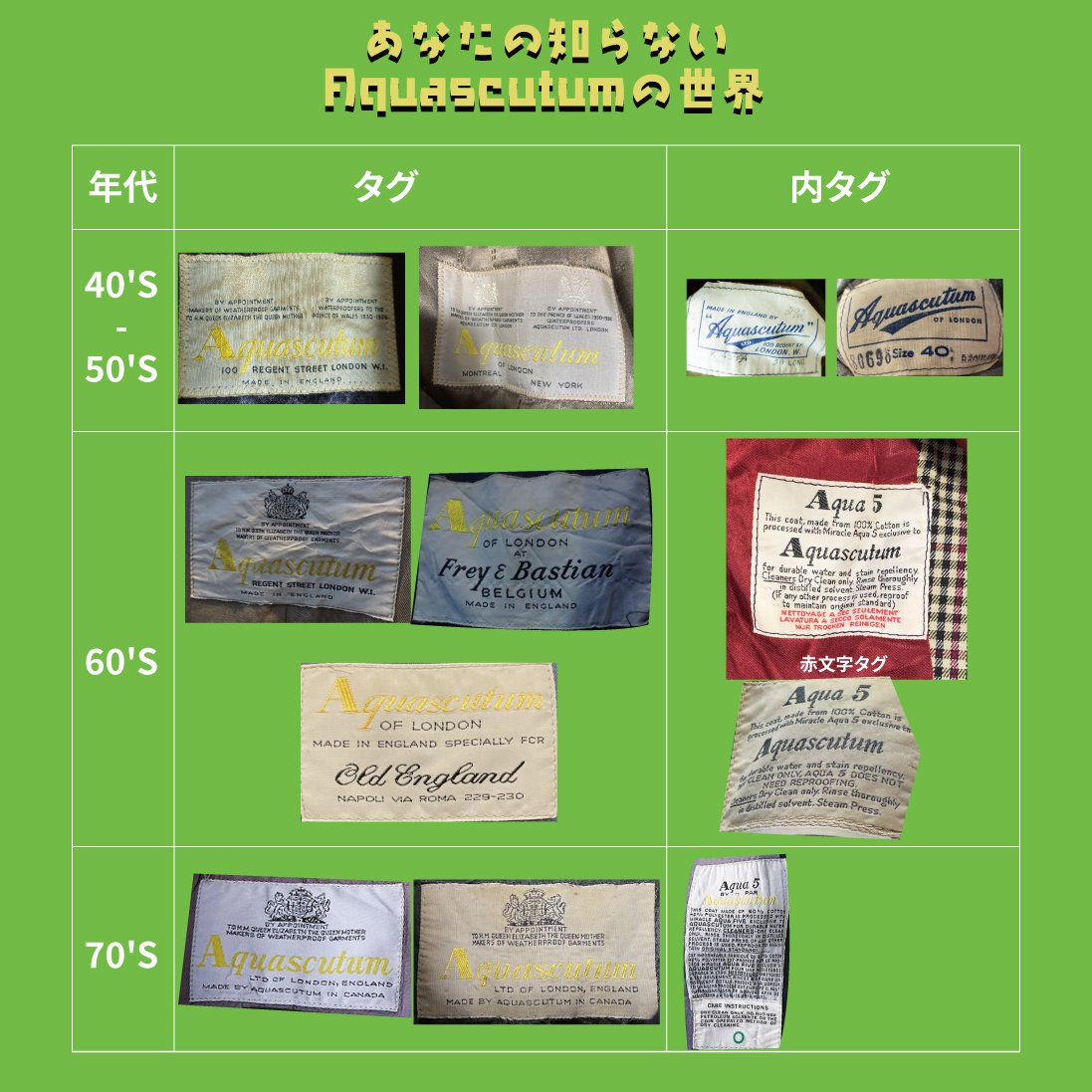 【ポイント】 古着でトレンチコートやバルマカーンコートを探す際は、裏地に付いている**「Aqua 5」タグの「色」と「記載内容」**を確認することが、おおよその年代を知る手がかりになります。ただし、国やライセンスによって例外もあるため、あくまで目安として楽しんでくださいね。