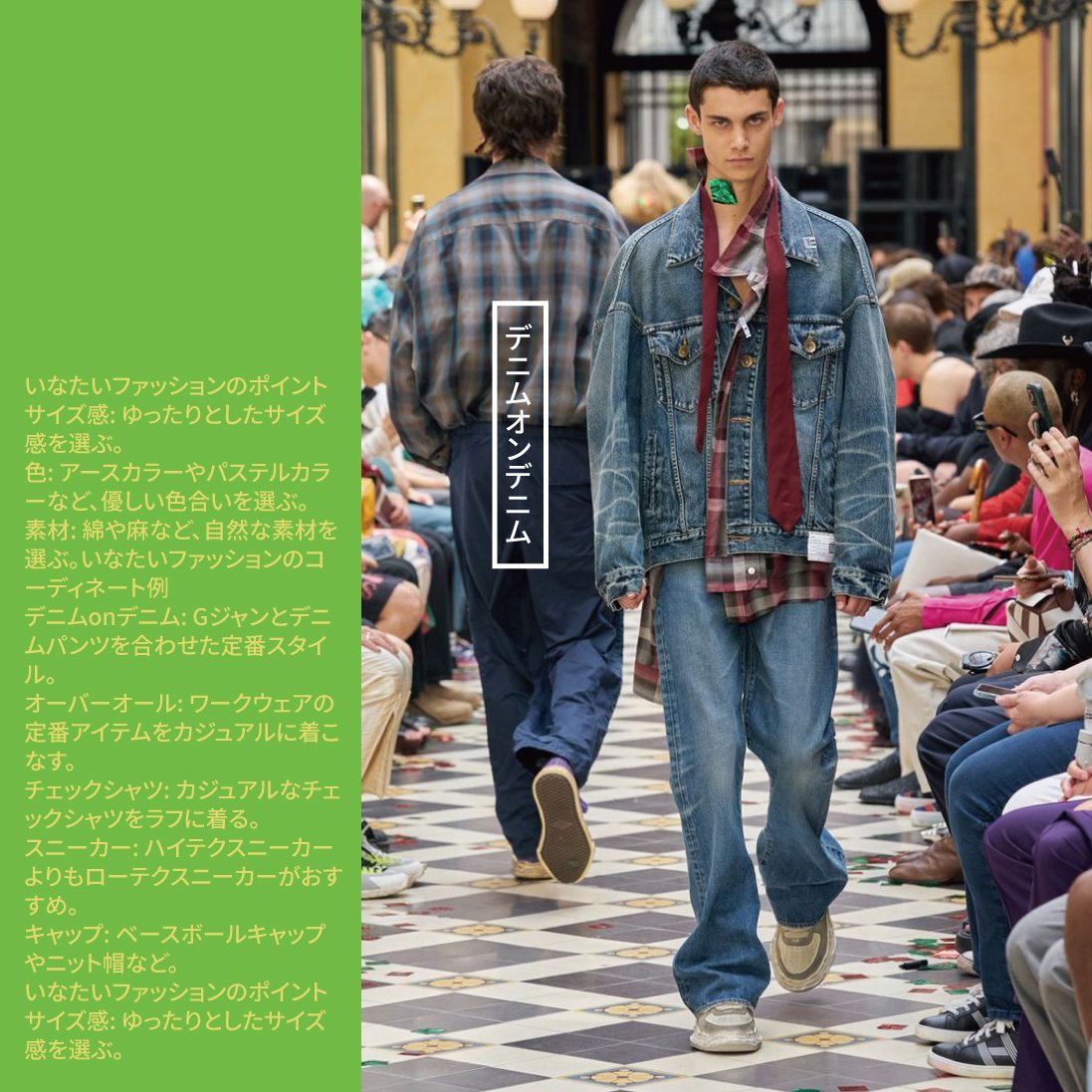 サイズ感の調整: トップスがいなたい場合、ボトムスはやや細身にしたり、タックインでメリハリをつける。または、全体をオーバーサイズにする場合は、素材感や色味を統一して「ただの野暮ったさ」にしないこと。