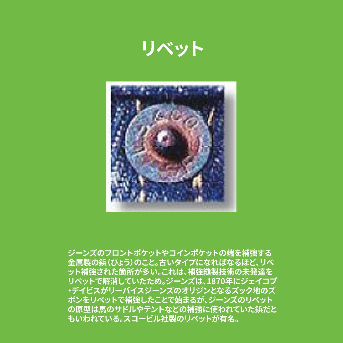 【用語解説】 ポケットの角など、負荷がかかり破れやすい部分を補強するために打ち込まれた金属製の鋲(びょう)のこと。ジーンズの創始者であるリーバイ・ストラウスとジェイコブ・デイビスが特許を取得した、ジーンズのアイデンティティとも言えるパーツです。年代によってリベットの素材(銅、アルミなど)、形状、刻印が異なり、ヴィンテージデニムの真贋や時代を判断する際の重要な要素となります。隠しリベット(裏側に隠されたリベット)の有無や仕様も、年代判別の鍵です。