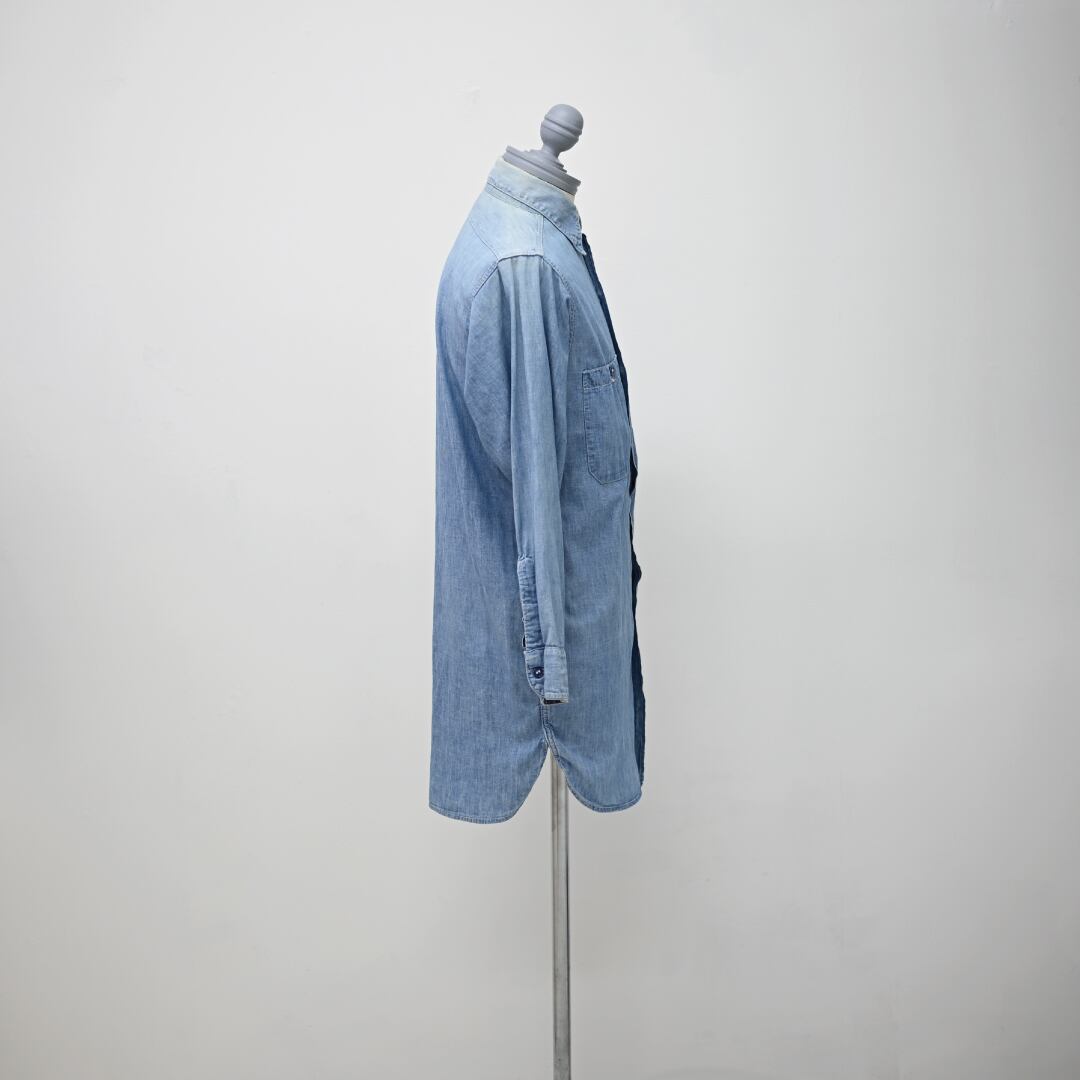 素材: コットン100%のシャンブレー生地。青い縦糸と白い横糸で織られており、独特の霜降りのような風合いと、着込むほどに増す経年変化が魅力です。