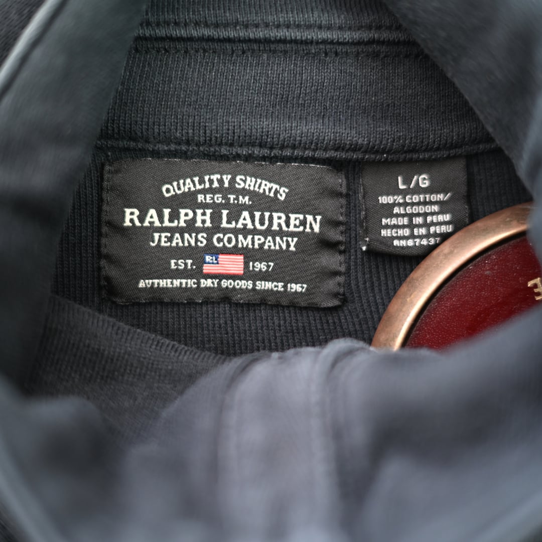 ラルフローレンのハイネックカットソーです。中央に配されたボーダー柄が特徴で、首元の猫目ボタンがアクセントになっています。