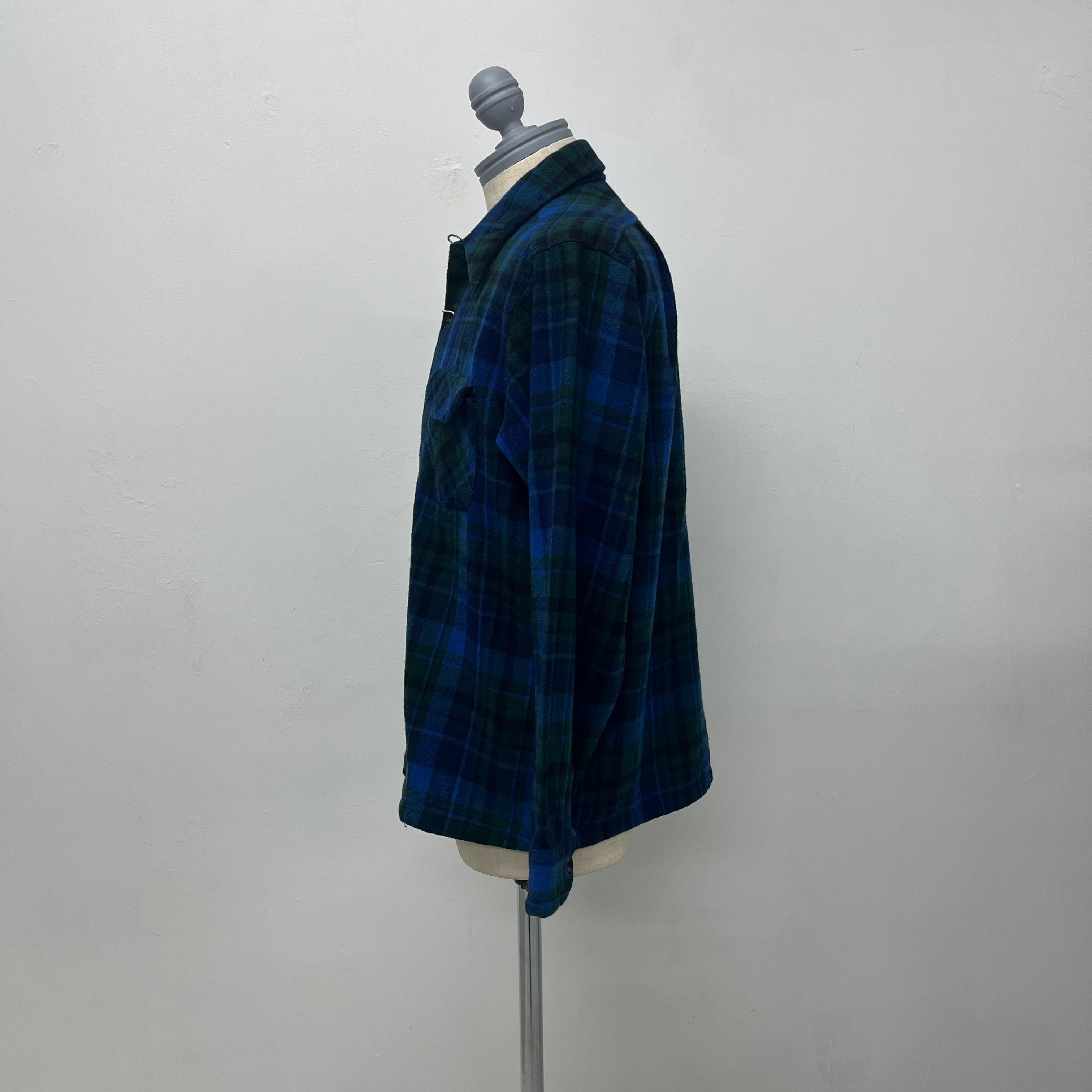 当時のPENDLETONらしい、存在感のあるチェック柄と、ビンテージならではの風合いが魅力的です。サイズはLで、程よくゆったりとしたシルエットは、一枚で着るのはもちろん、パーカーやセーターの上に羽織るアウターとしても重宝します。