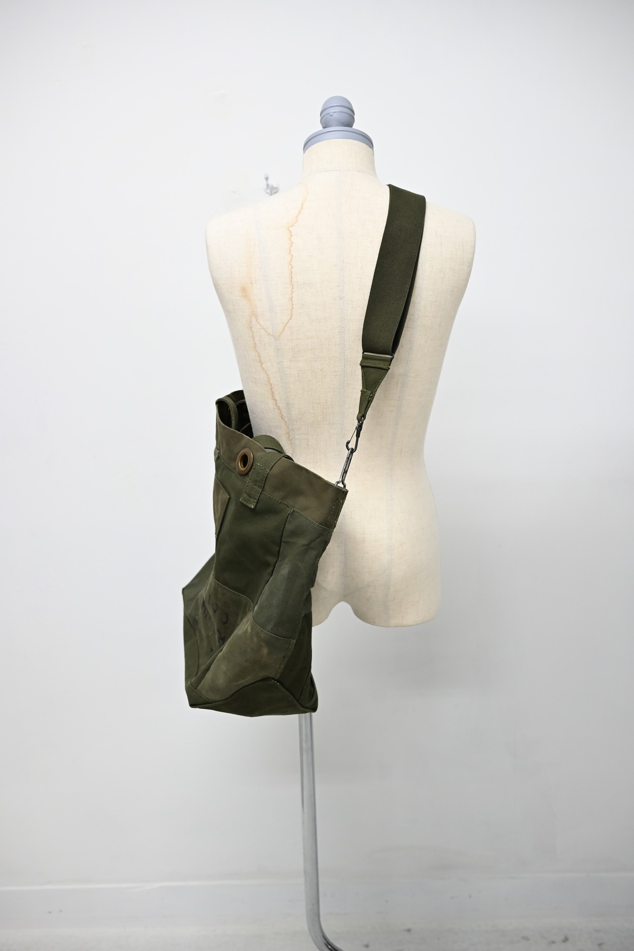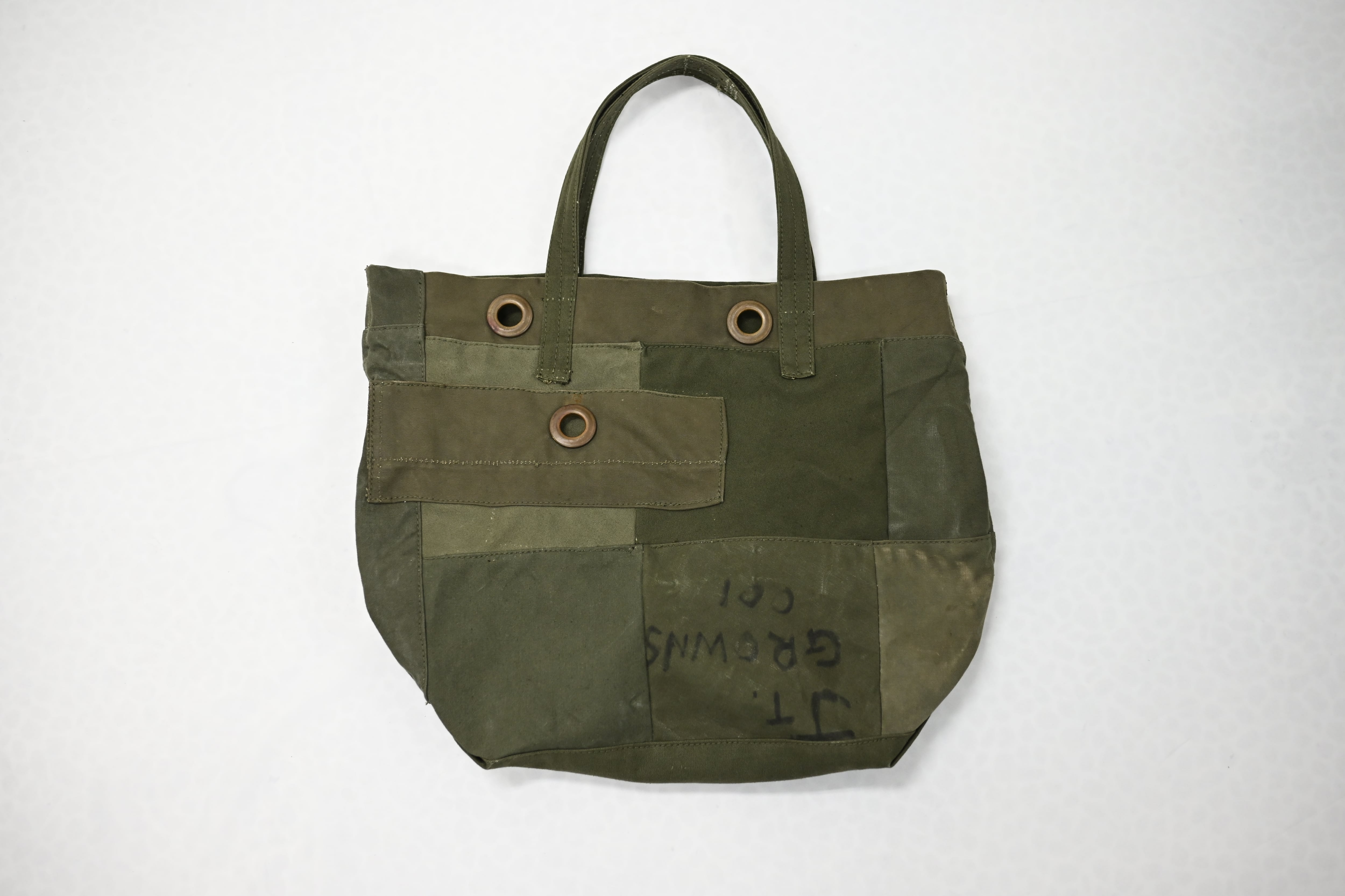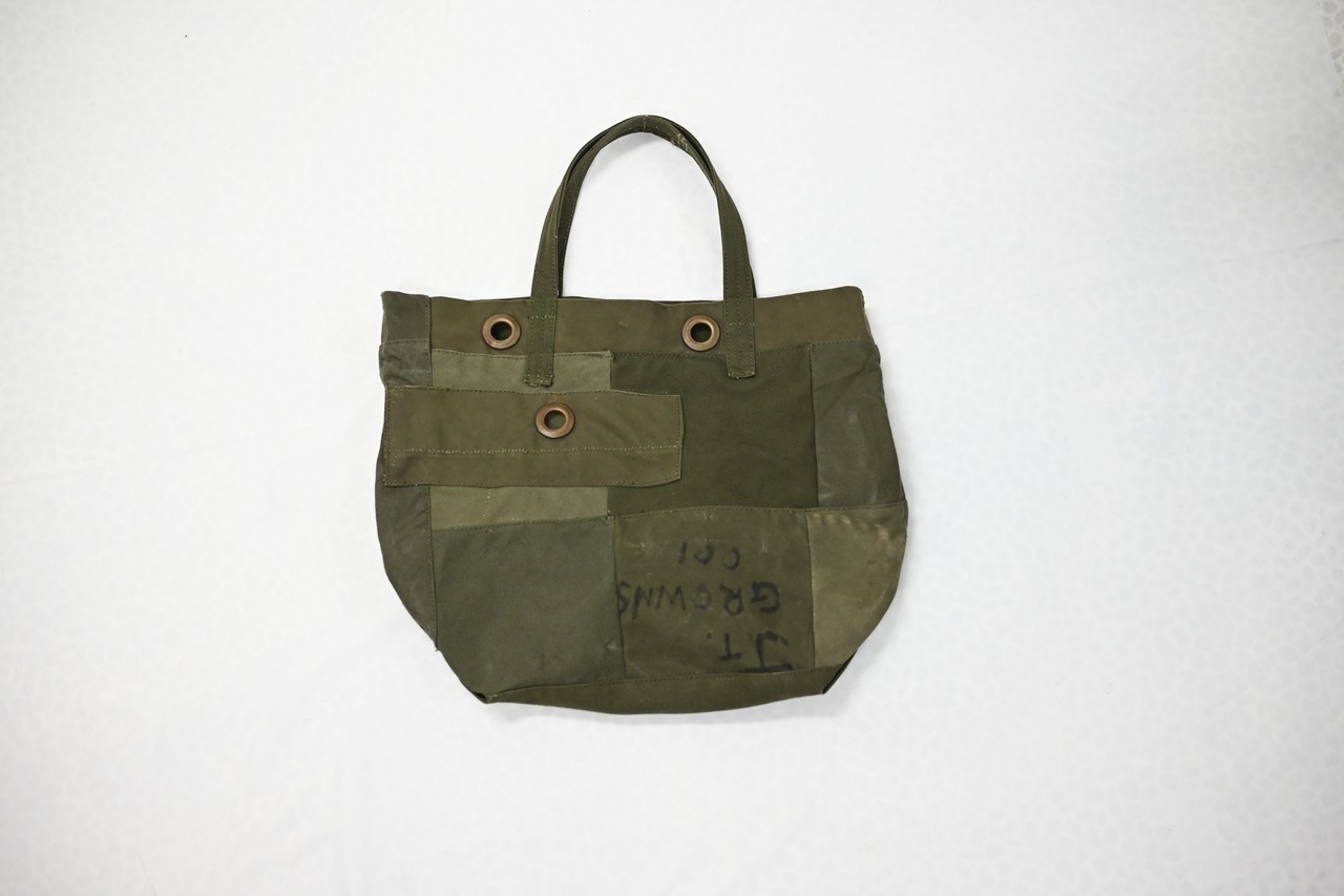 メイン素材: 味わい深いイギリス軍放出品のダッフルバッグを解体し、パッチワークして仕立てました。長年使い込まれた生地の風合いが、他にはない魅力的な表情を生み出しています。