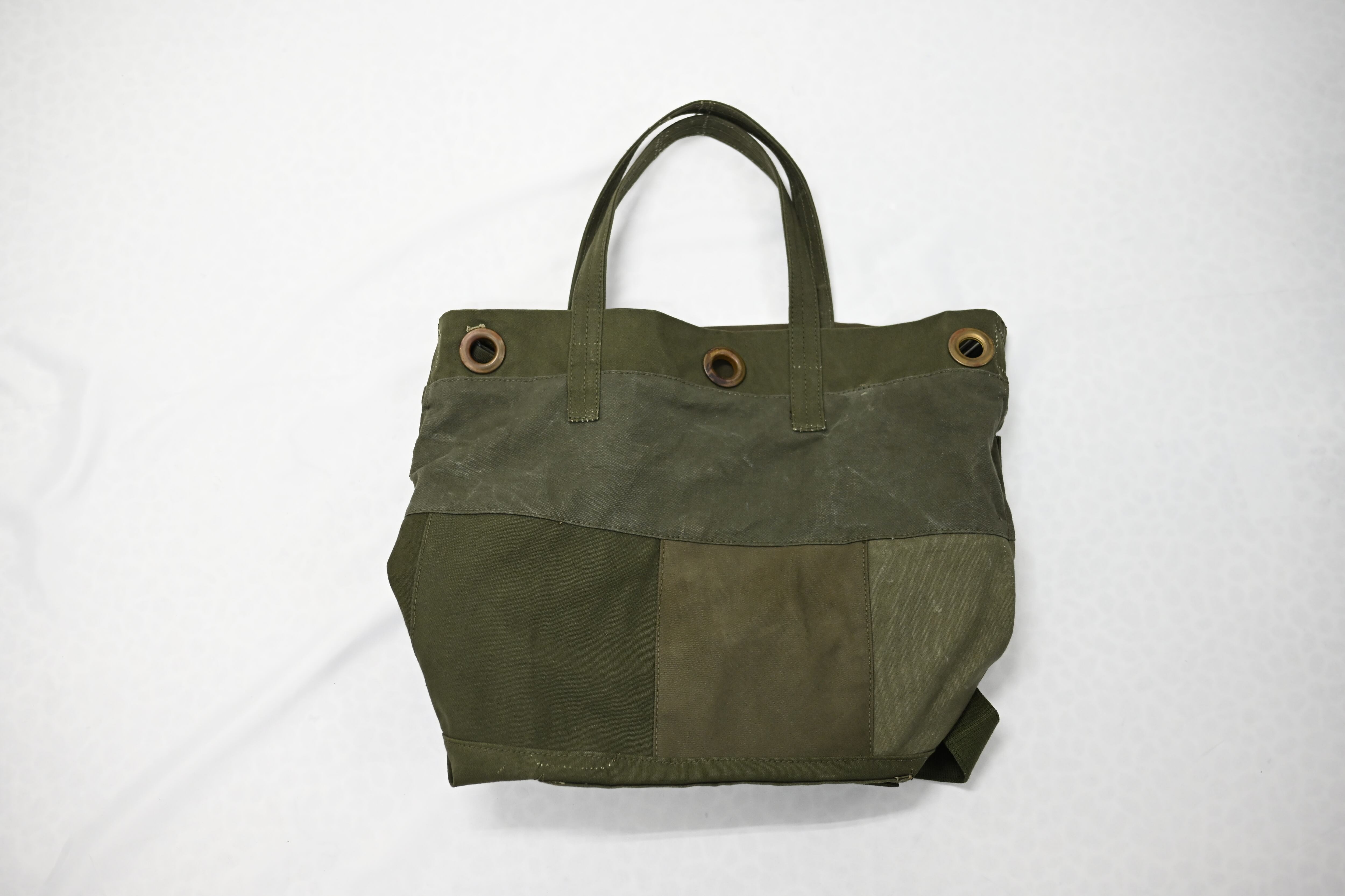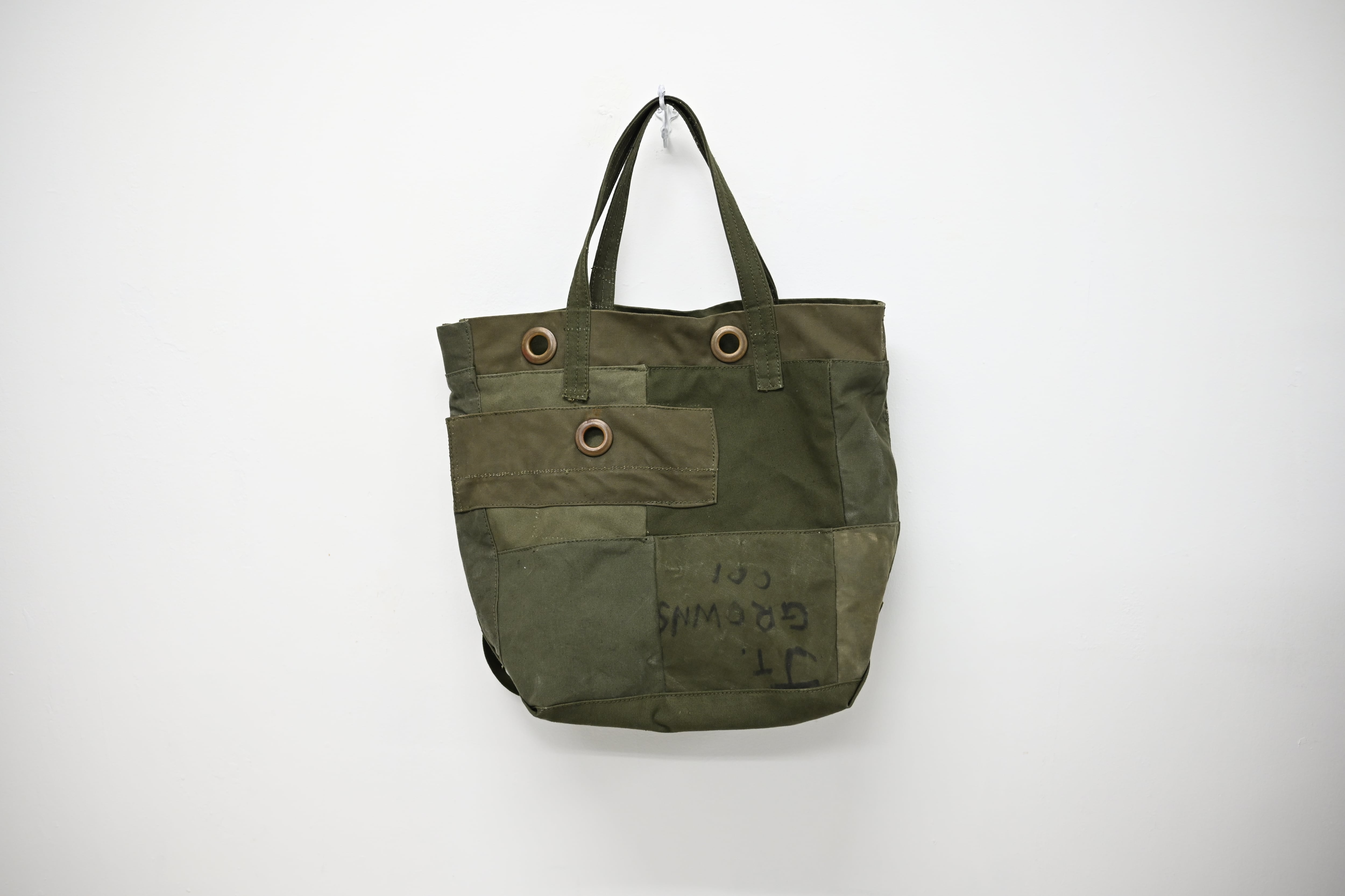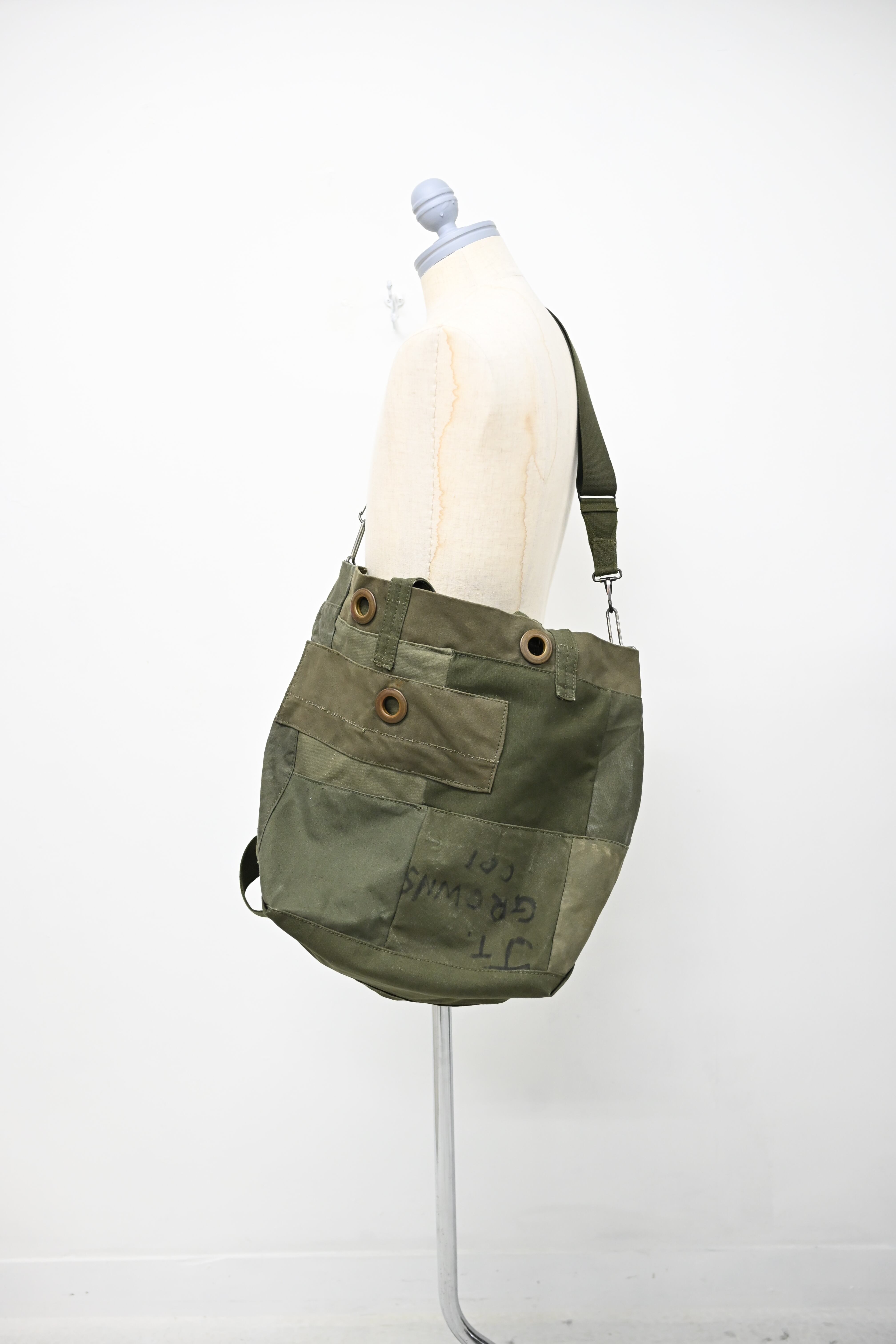 【一点物】イギリス軍ダッフルバッグ解体リメイク・パッチワーク2WAYトートバッグ (米軍キャリングストラップ付)