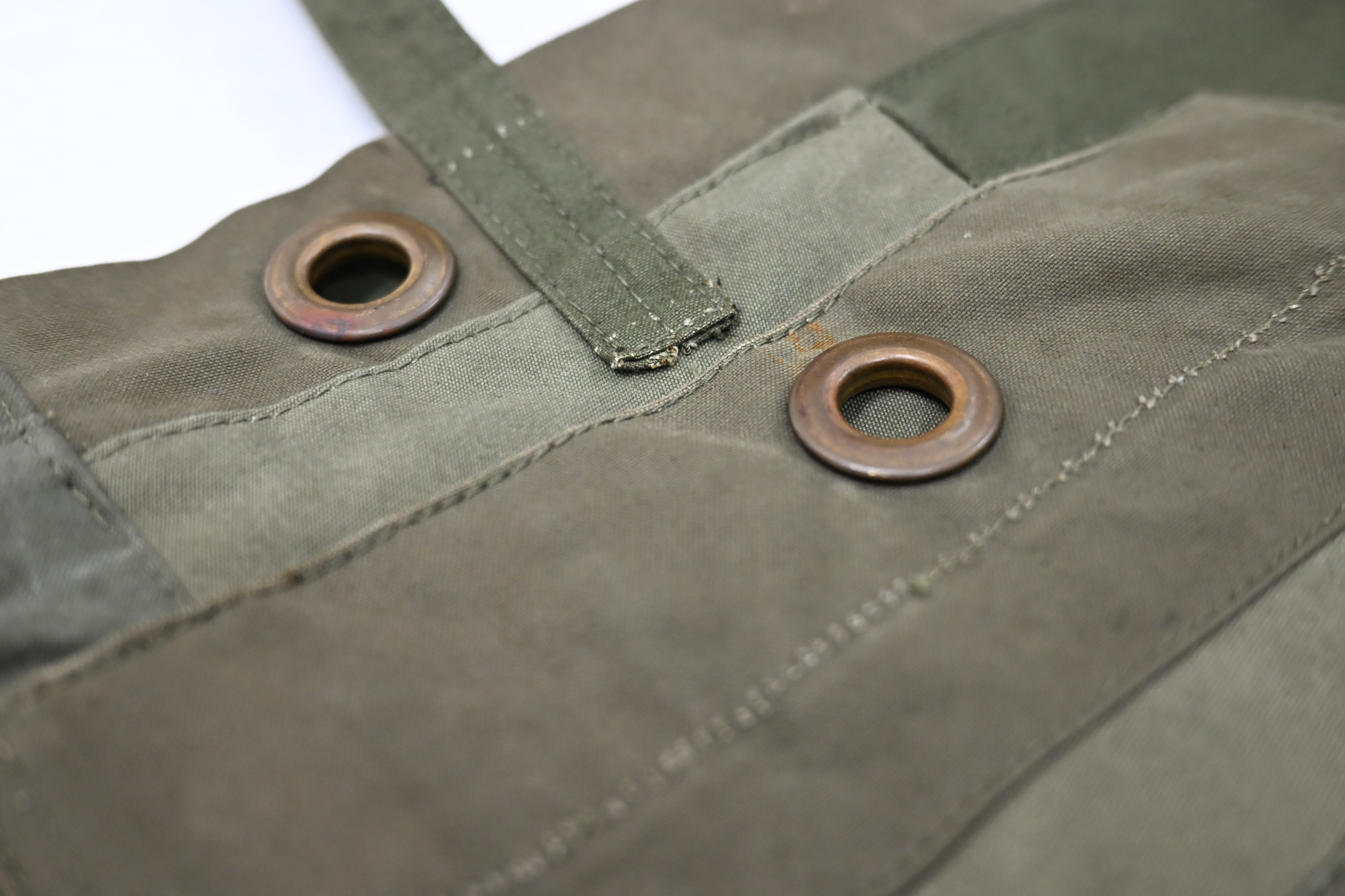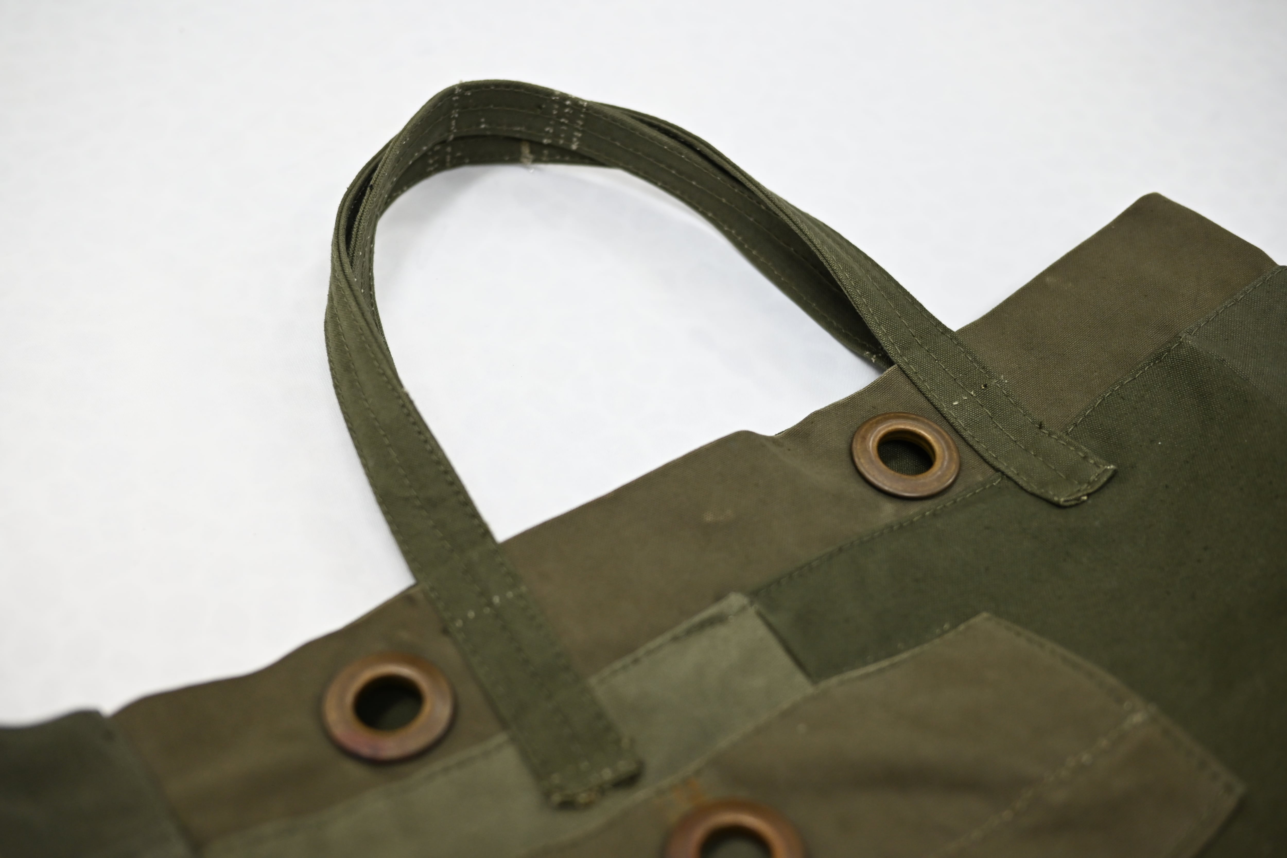 ディテール: ダッフルバッグに付いていたハトメをそのまま活かしてデザインのアクセントとしています。武骨な素材感と相まって、ミリタリーテイストを強く感じさせます。