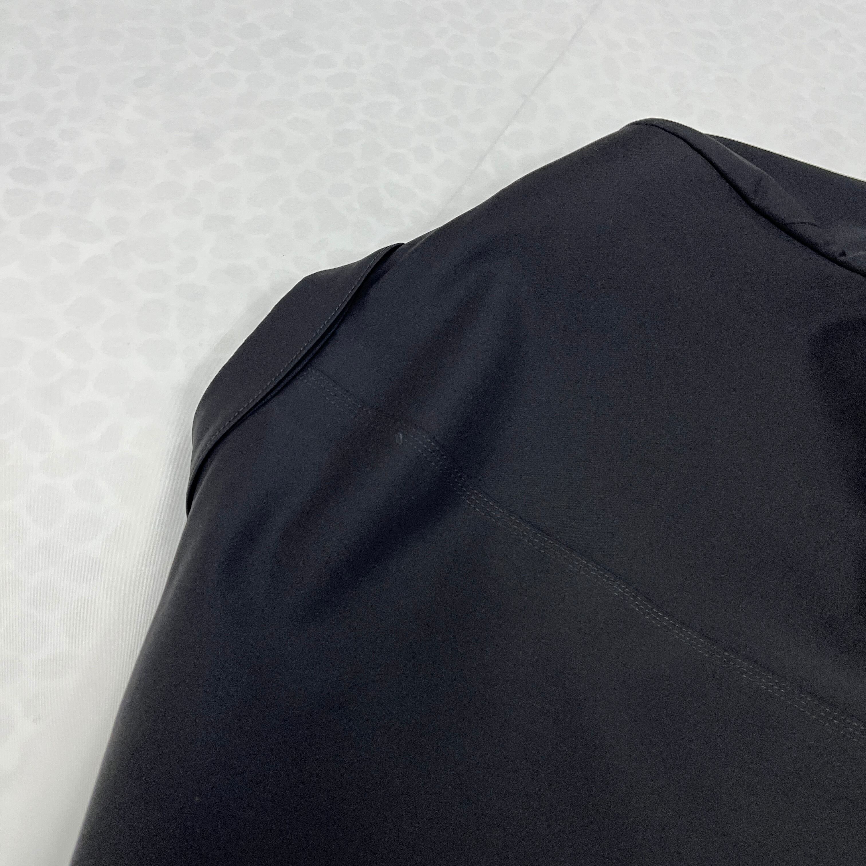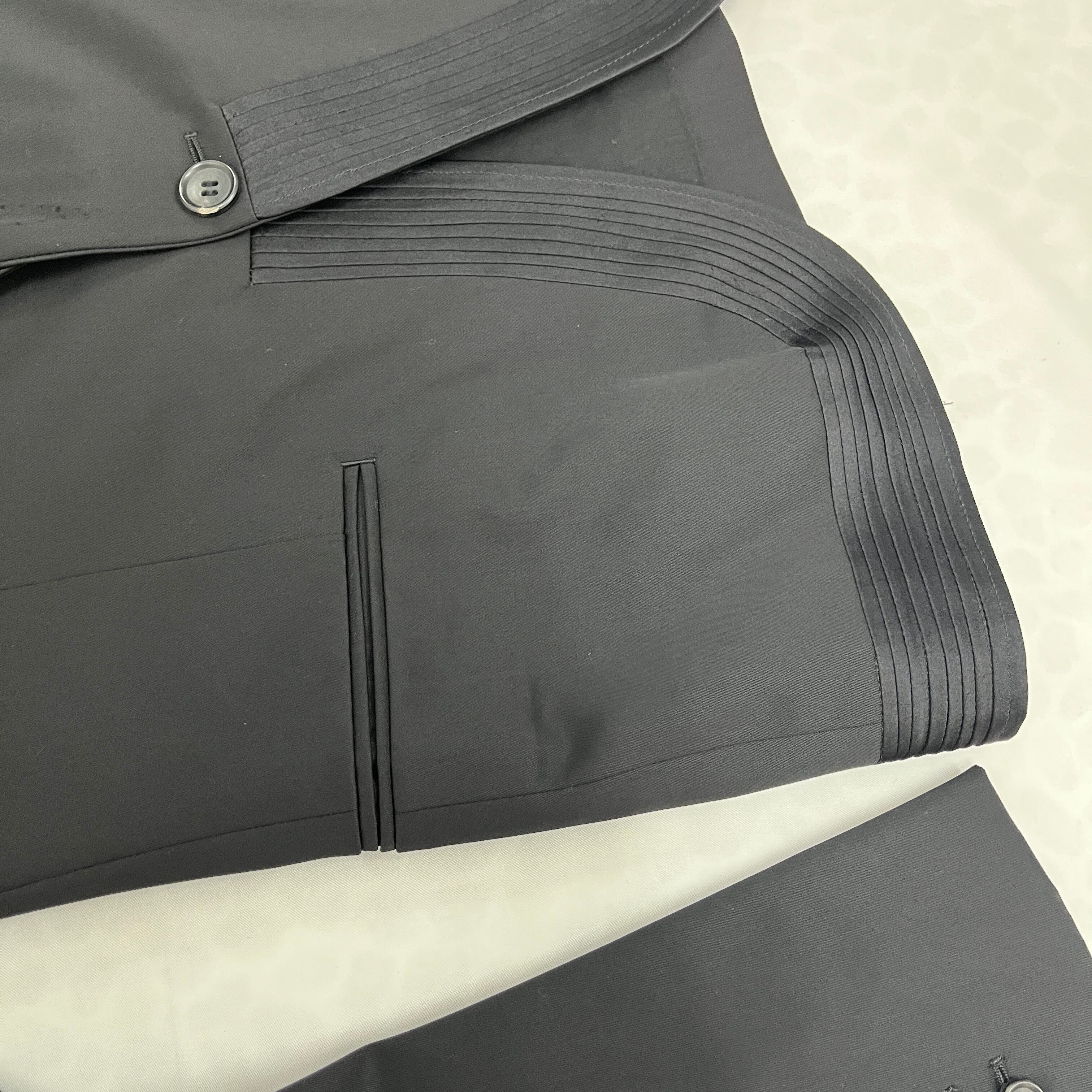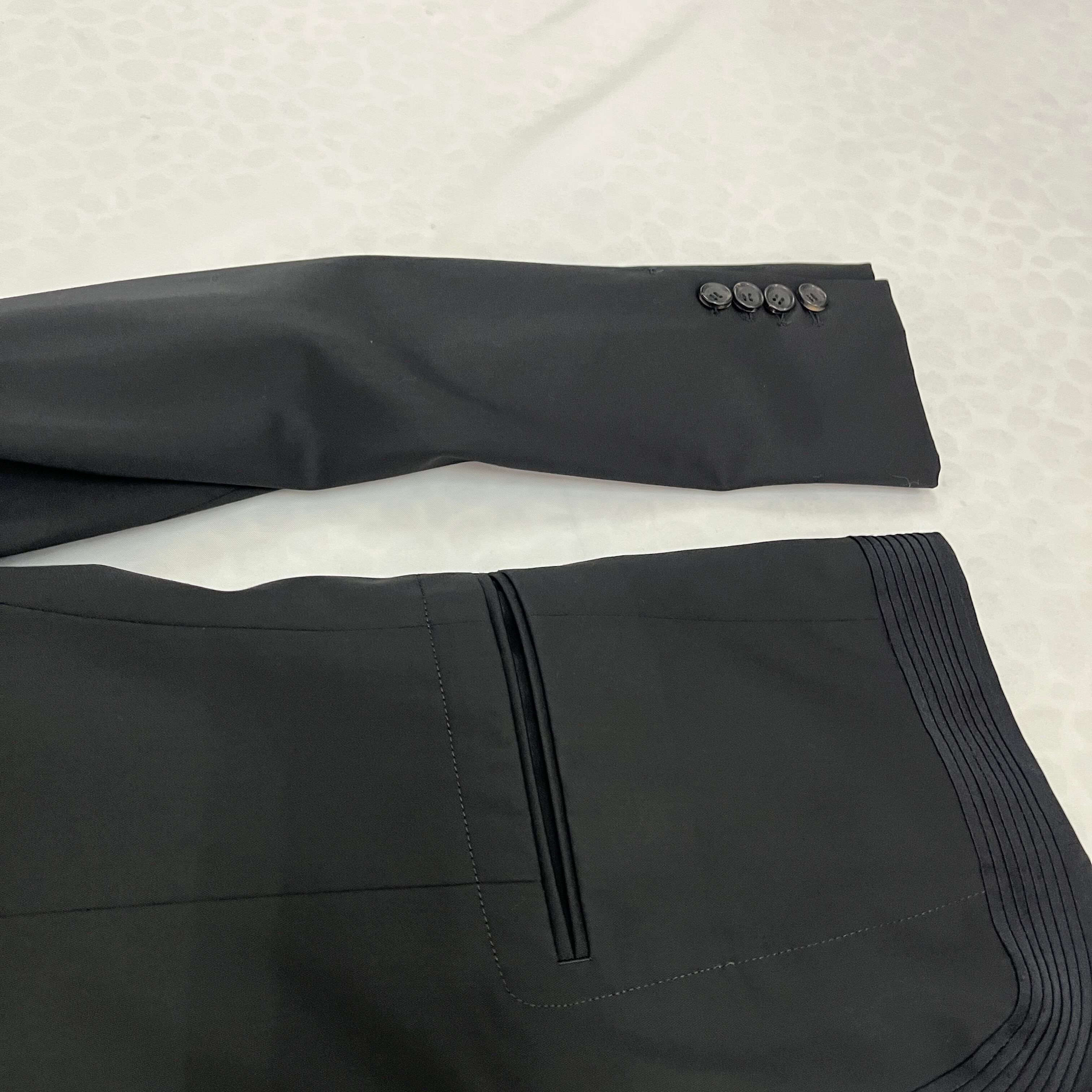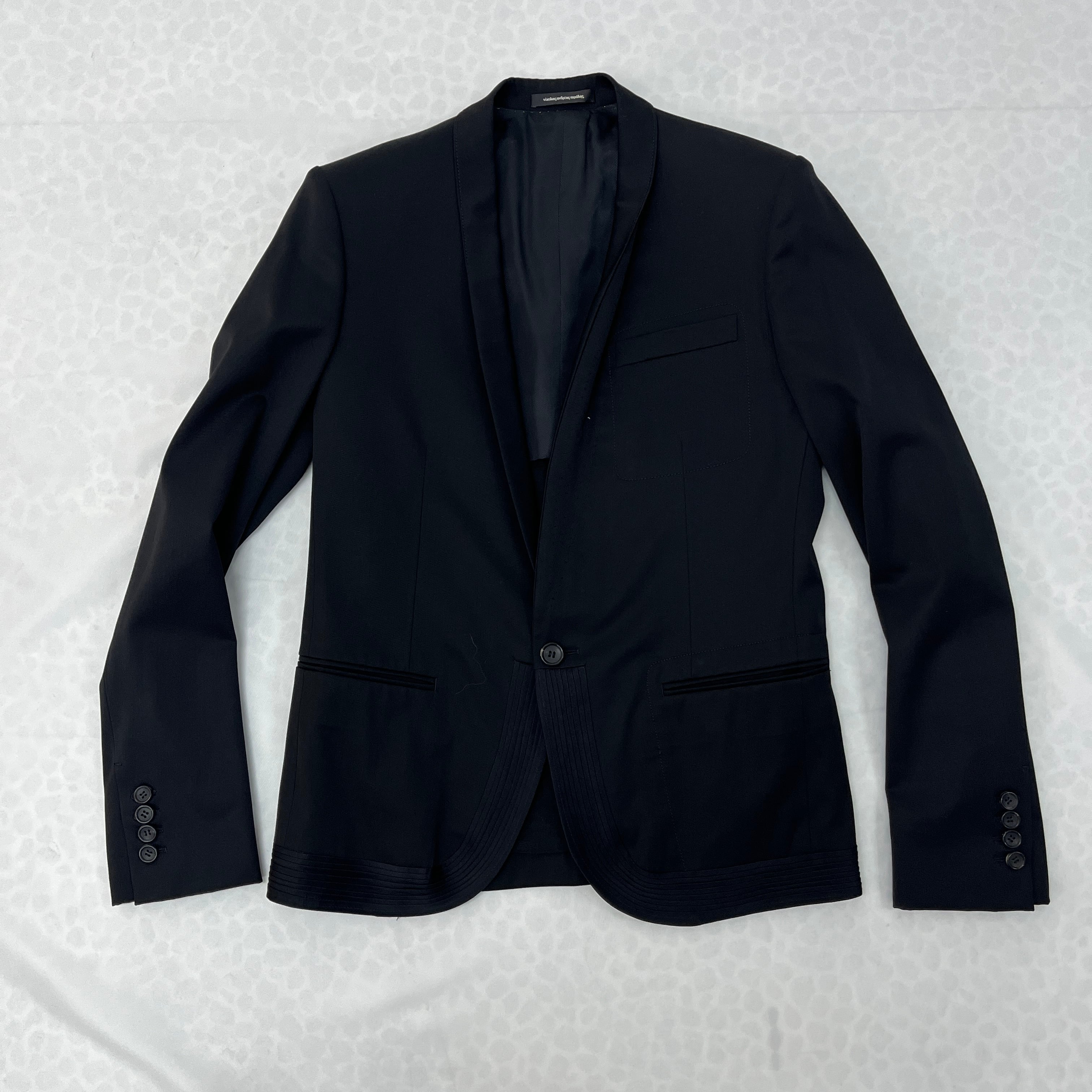 最大の特徴は、エレガントな印象を与えるショールカラー(へちま襟)と、デザインアクセントとなるピンタック裾。通常のテーラードジャケットとは一線を画す、モードでモダンな雰囲気です。