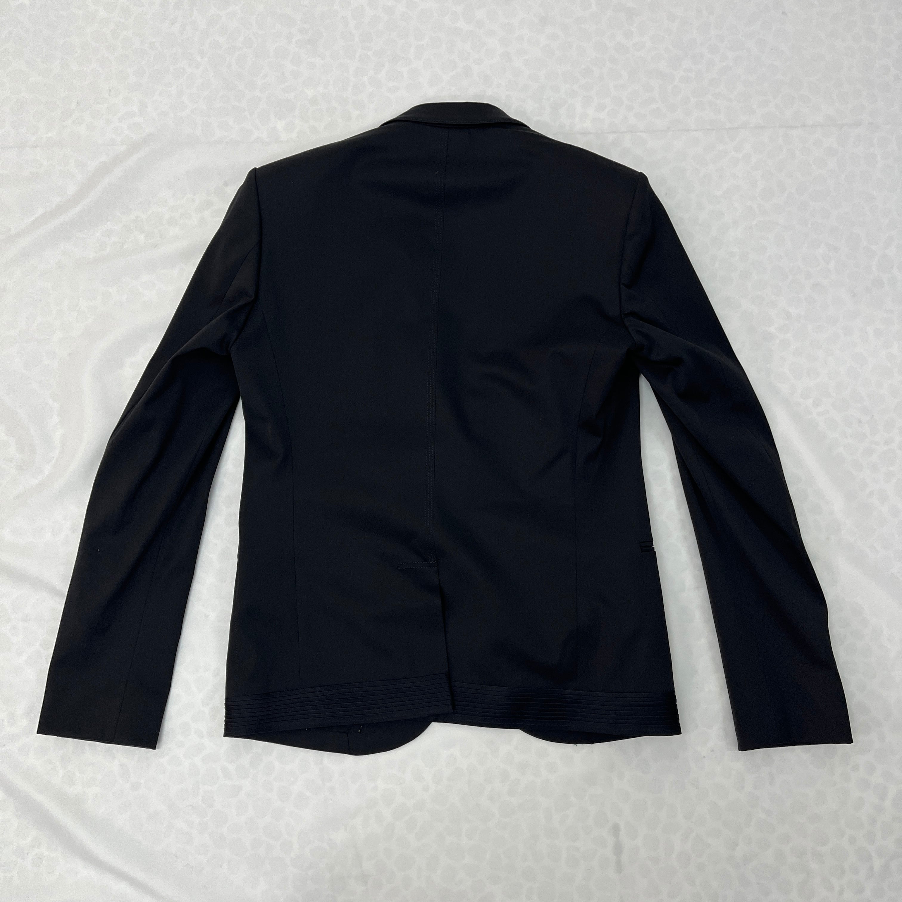 フロントはすっきりとしたシングルボタン仕様。背面にはスリットが入っており、動きやすさと共に美しいシルエットをキープします。ミニマルなブラックカラーは、カジュアルからドレッシーなスタイルまで幅広く対応します。