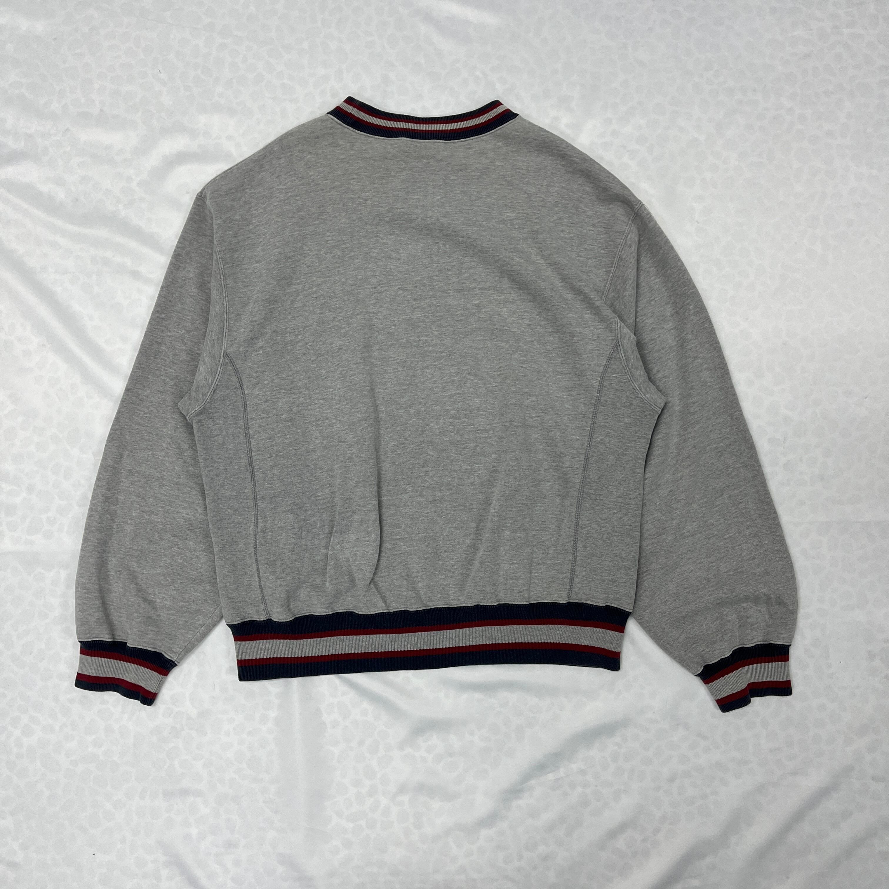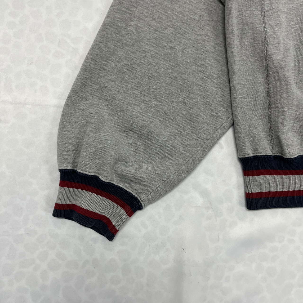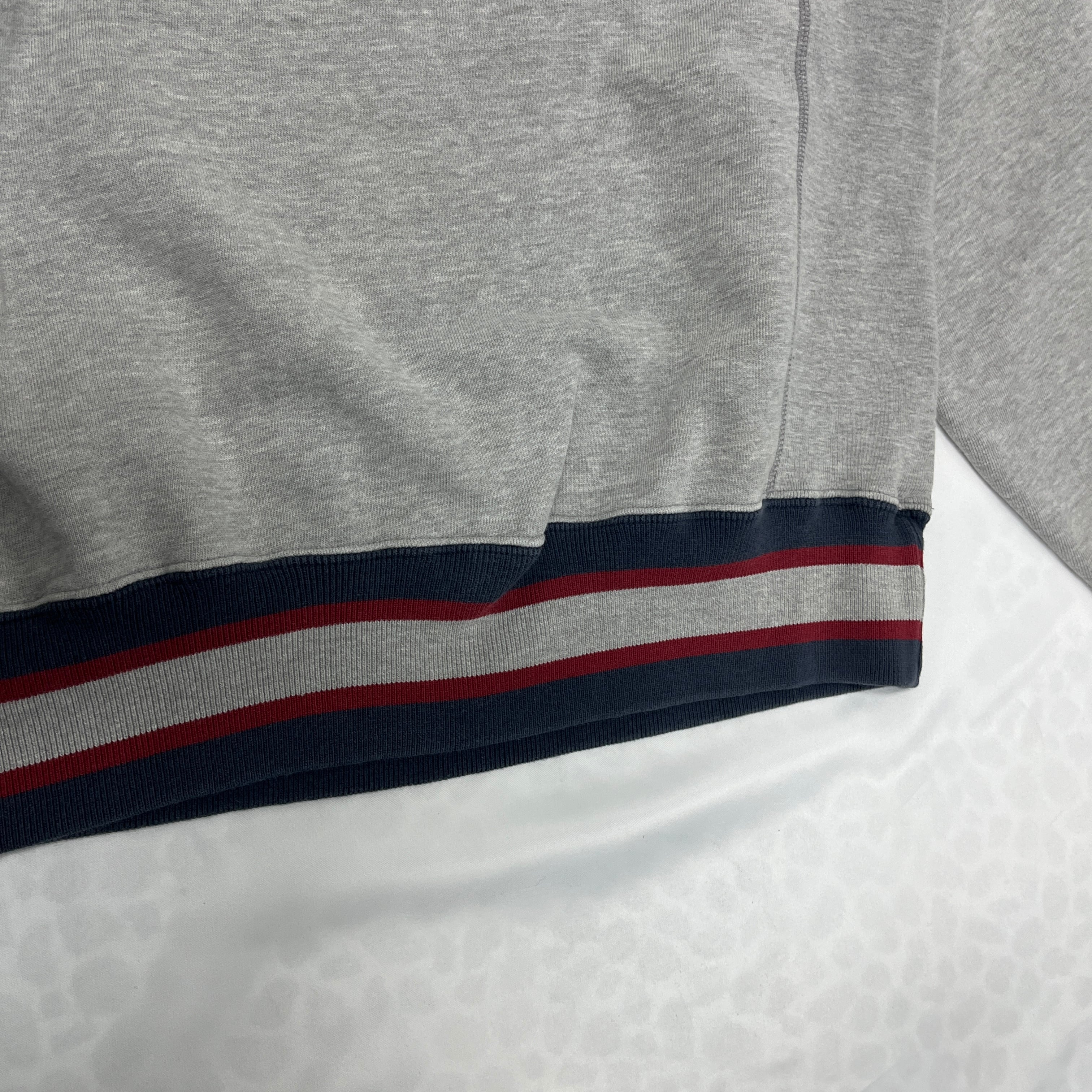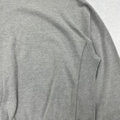リブボーダー: 袖口と裾のリブがボーダーになっており、シンプルなグレーのボディにアクセントを加えています。