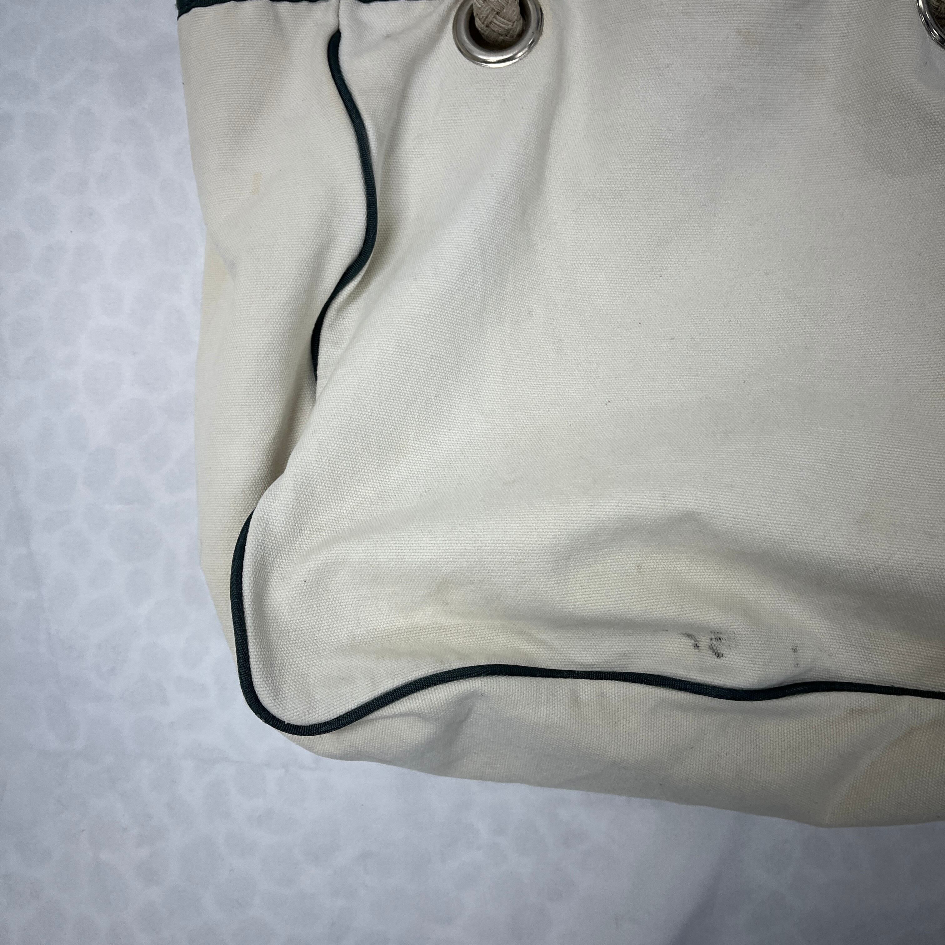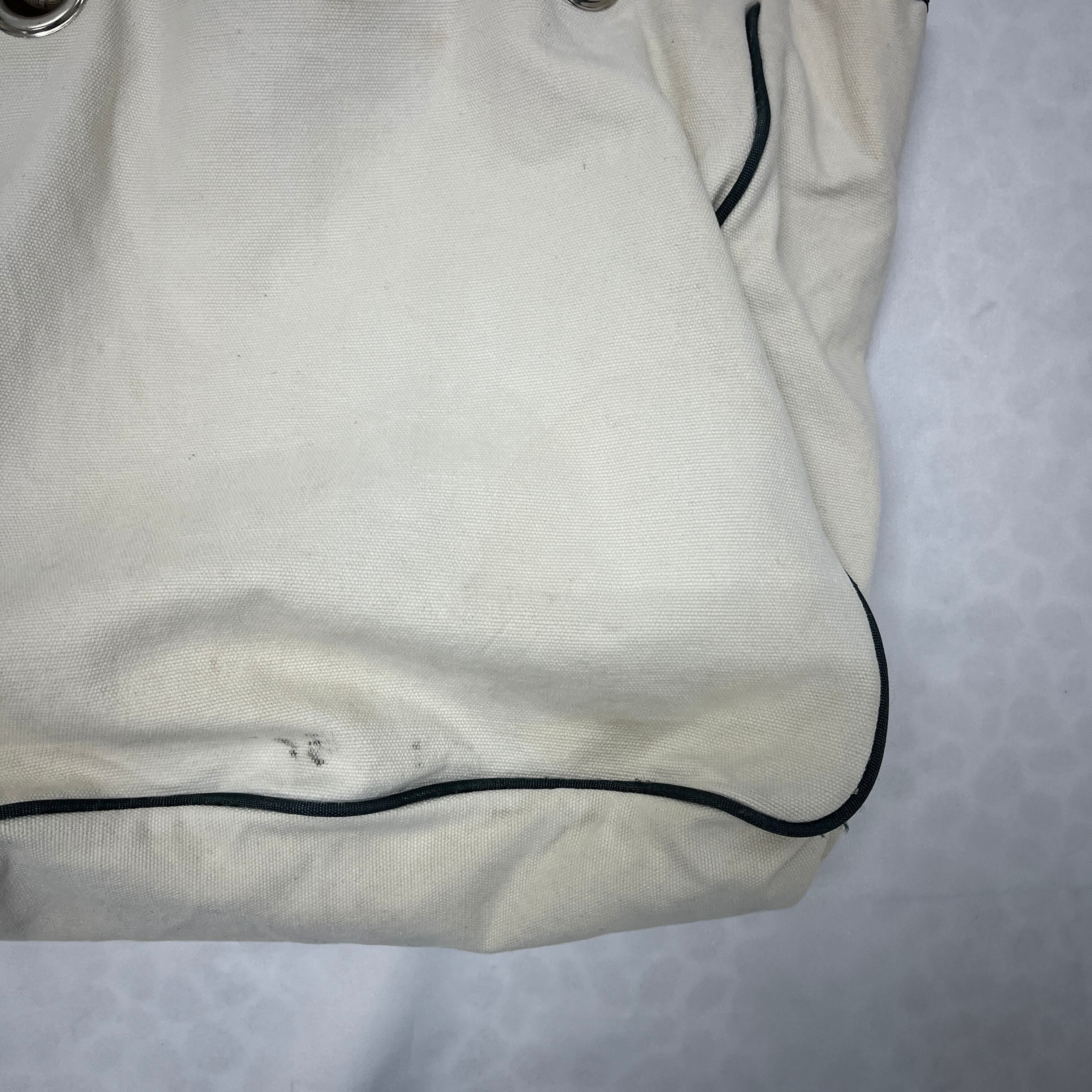 フロントのロゴデザインと、しっかりとしたキャンバス生地、そして特徴的なロープハンドルが魅力です。