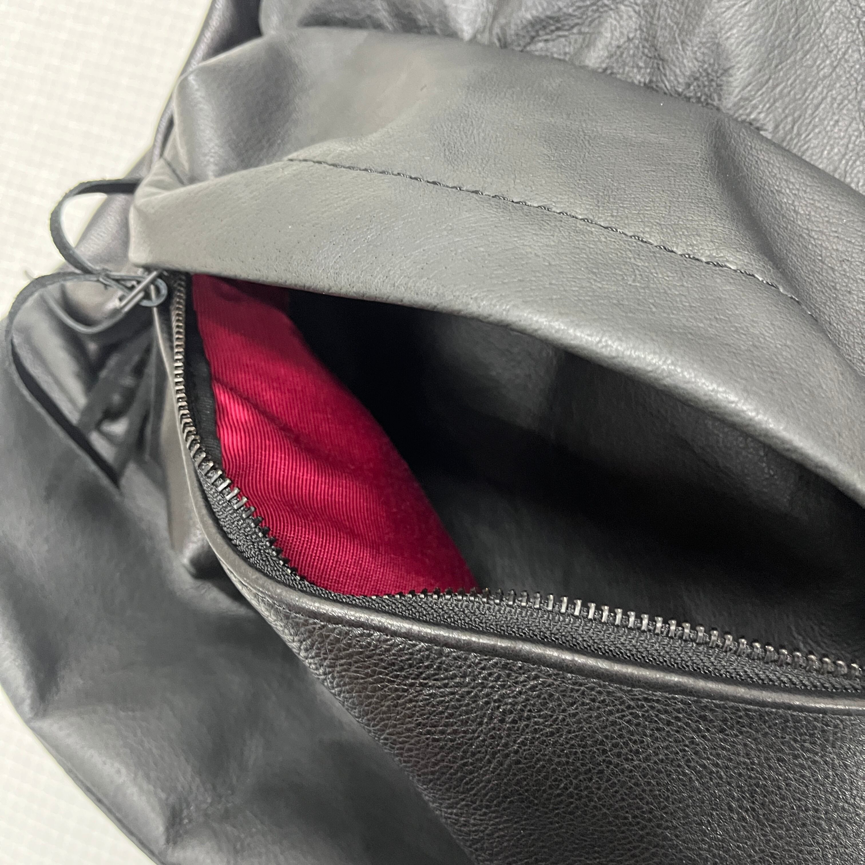 ファスナーを開けると、鮮やかな赤色の裏地が広がります。