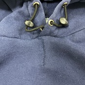 フード部分にはゴム紐アジャスターのパーツが見られますが、スピンドル(紐)は身頃から外れており、そのラフさも魅力の一つです。