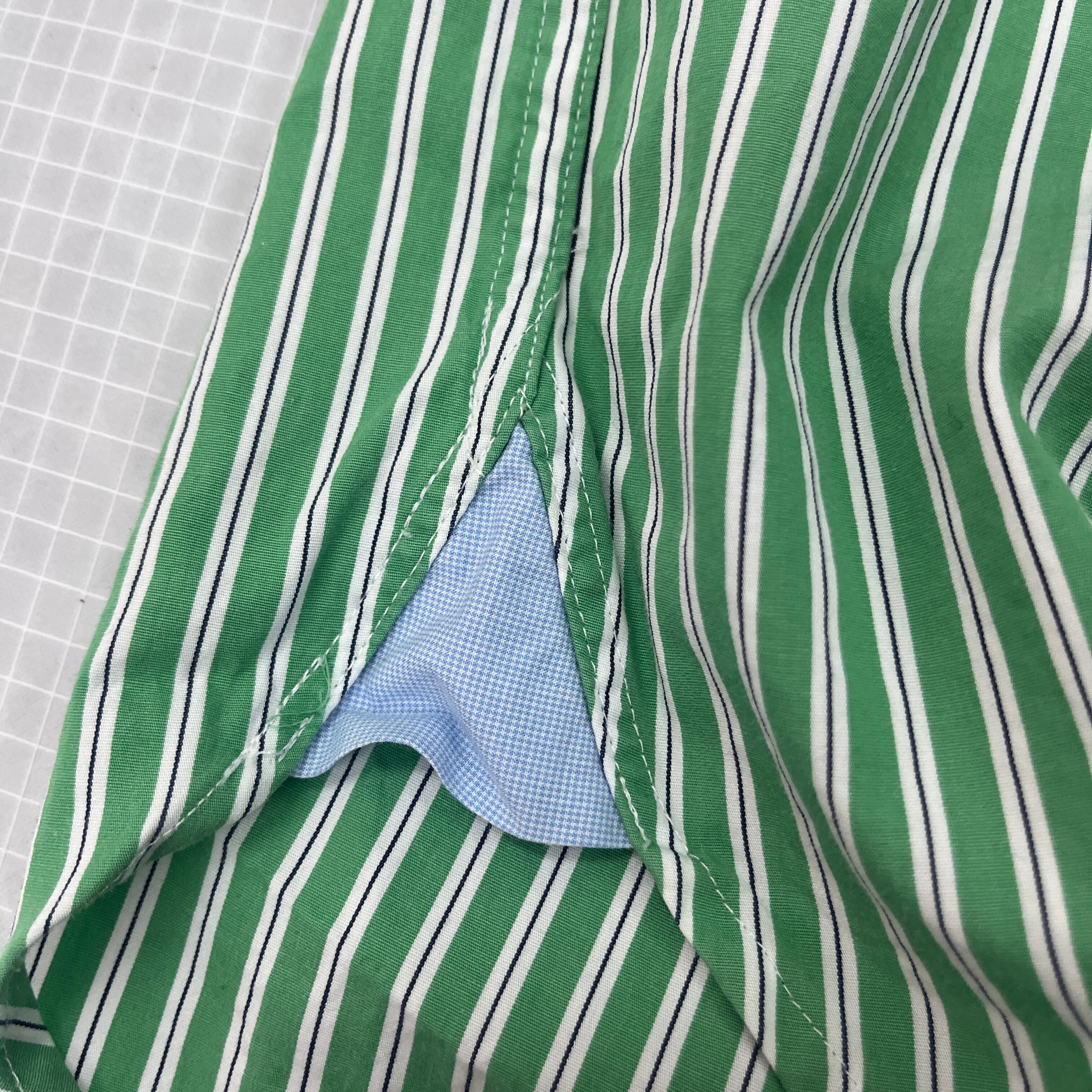襟裏、カフス裏、そして裾のサイドマチ(三角布)には「水色の細かいギンガムチェック」が採用されています。袖を捲った際や、襟元の隙間からチラリと覗くチェック柄が、圧倒的な洒落感を演出します。