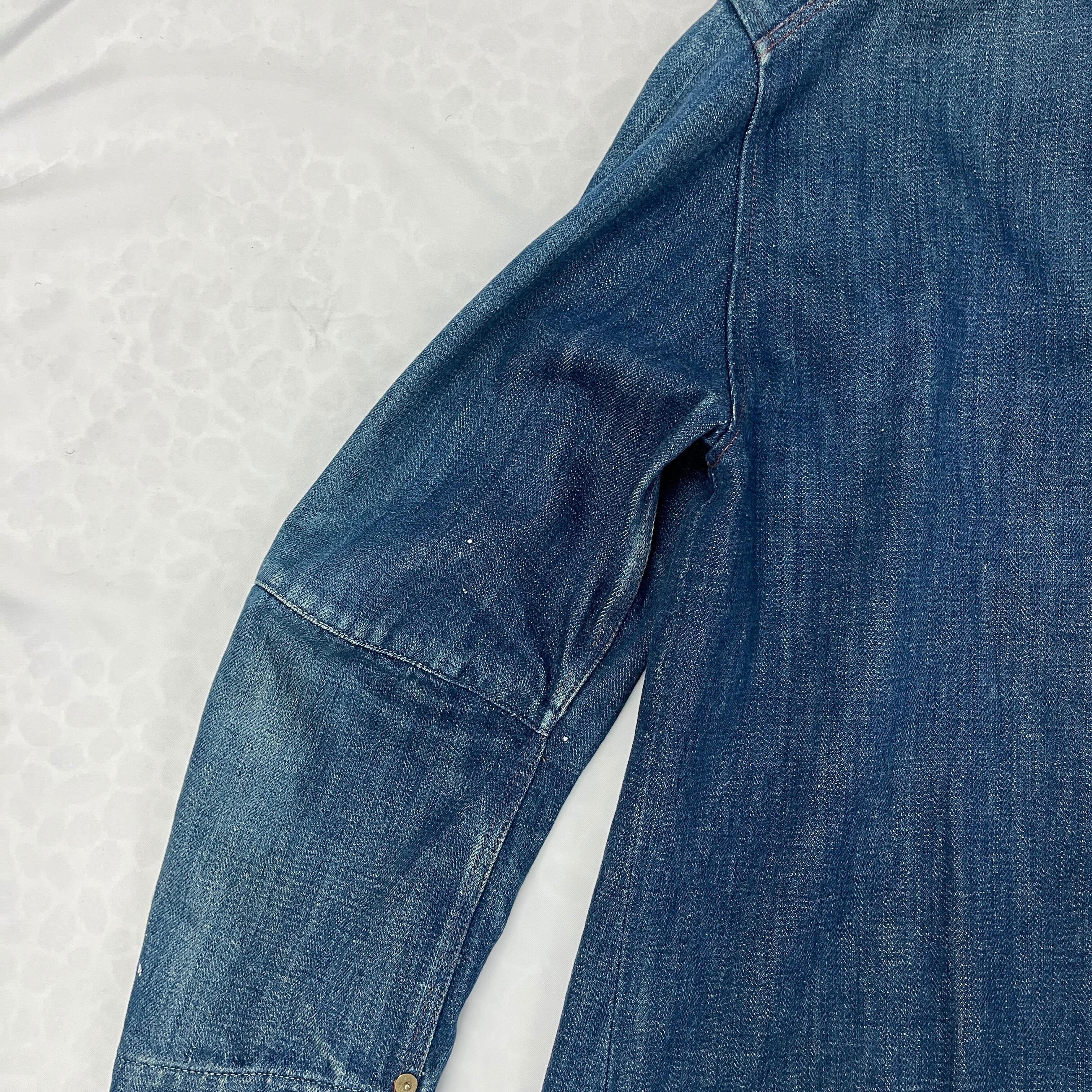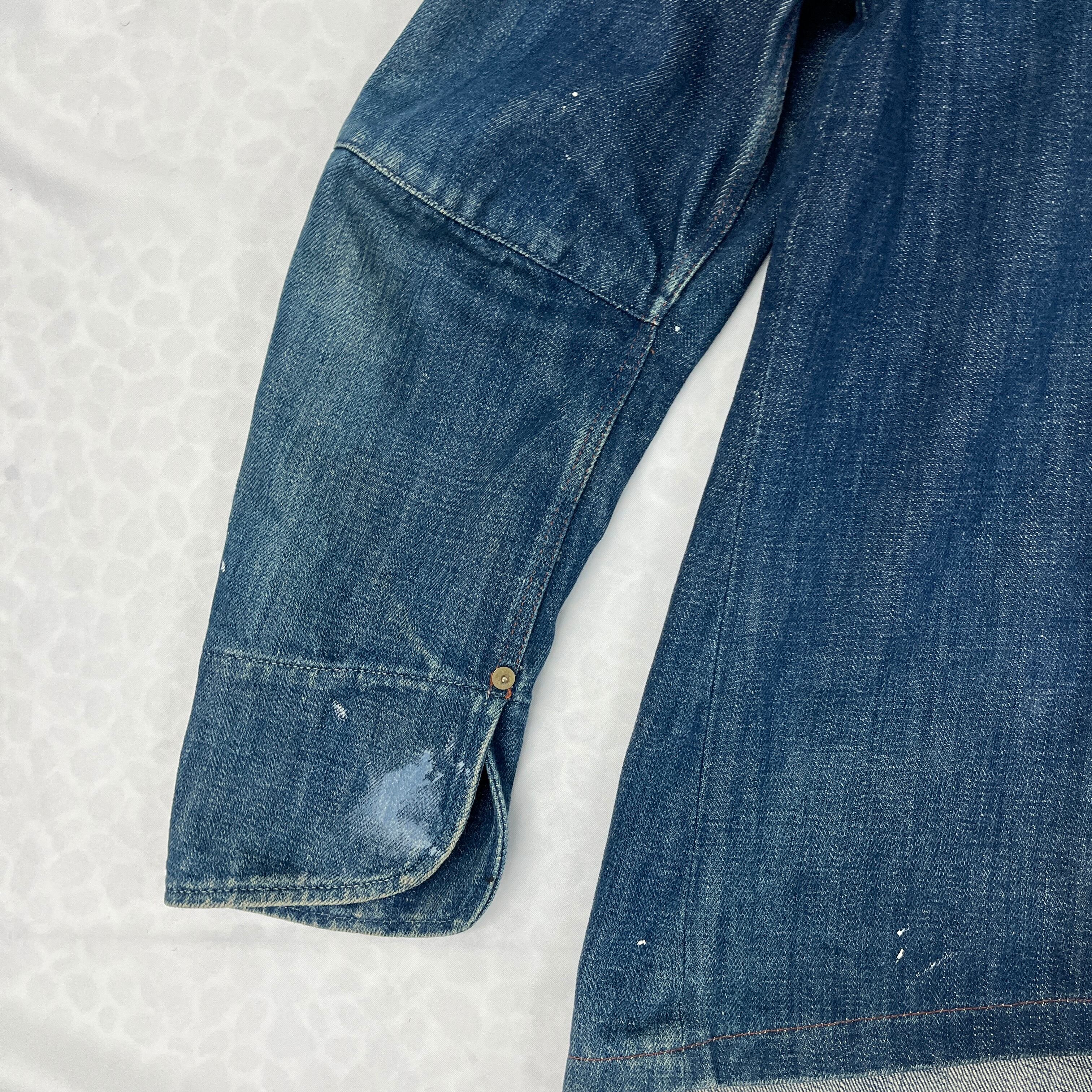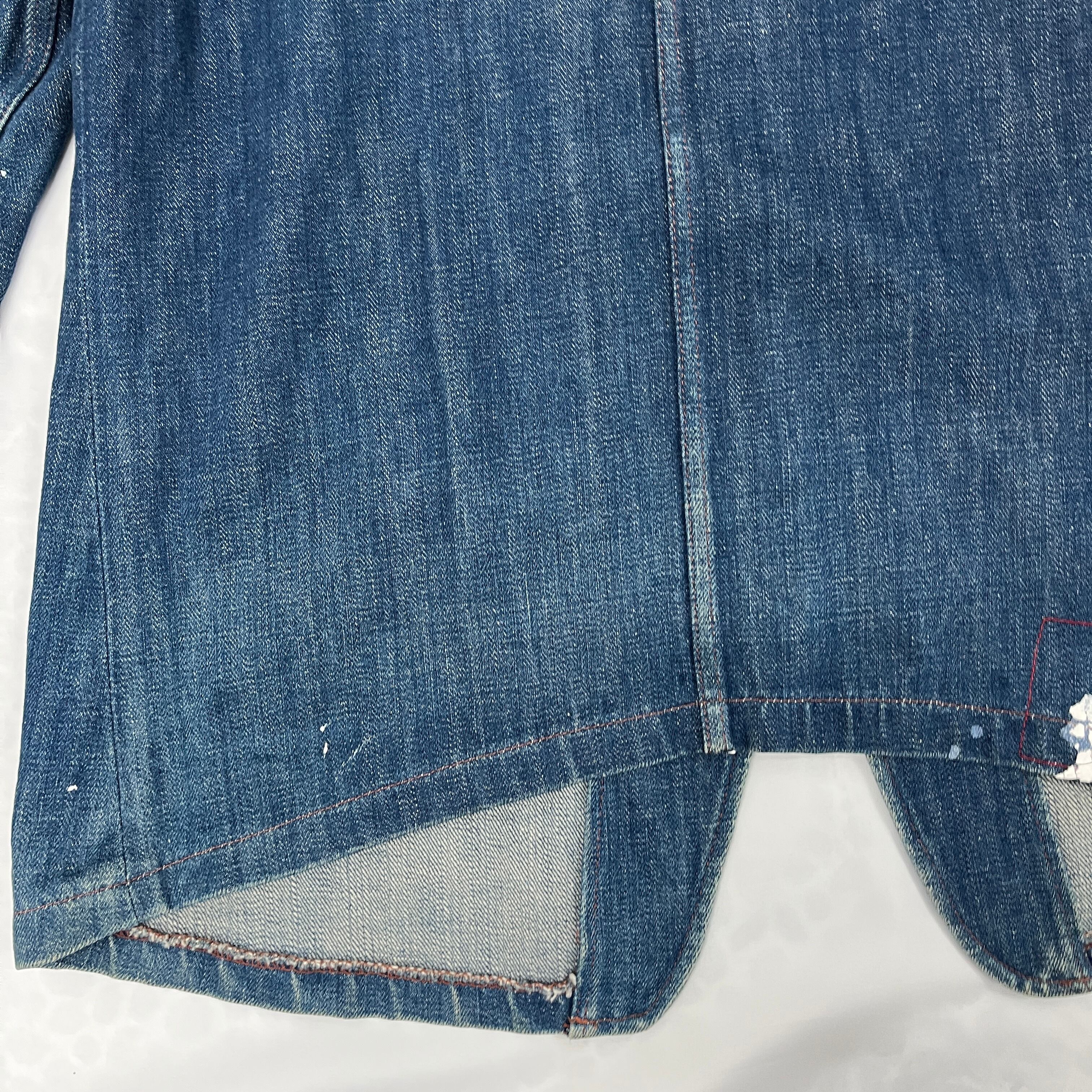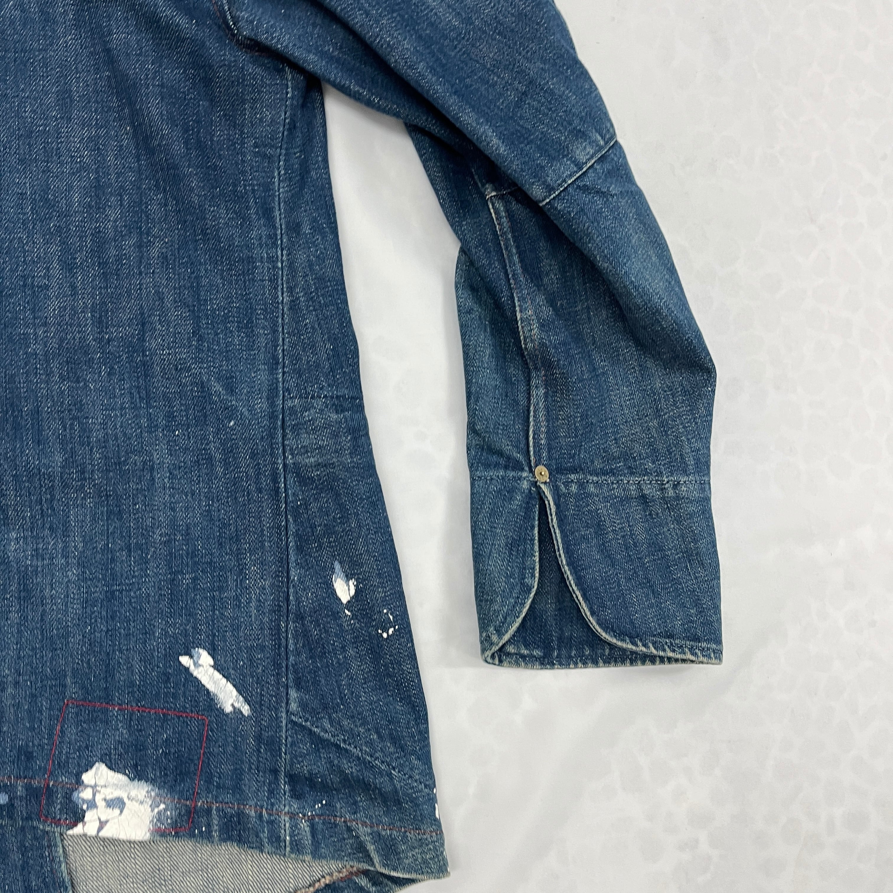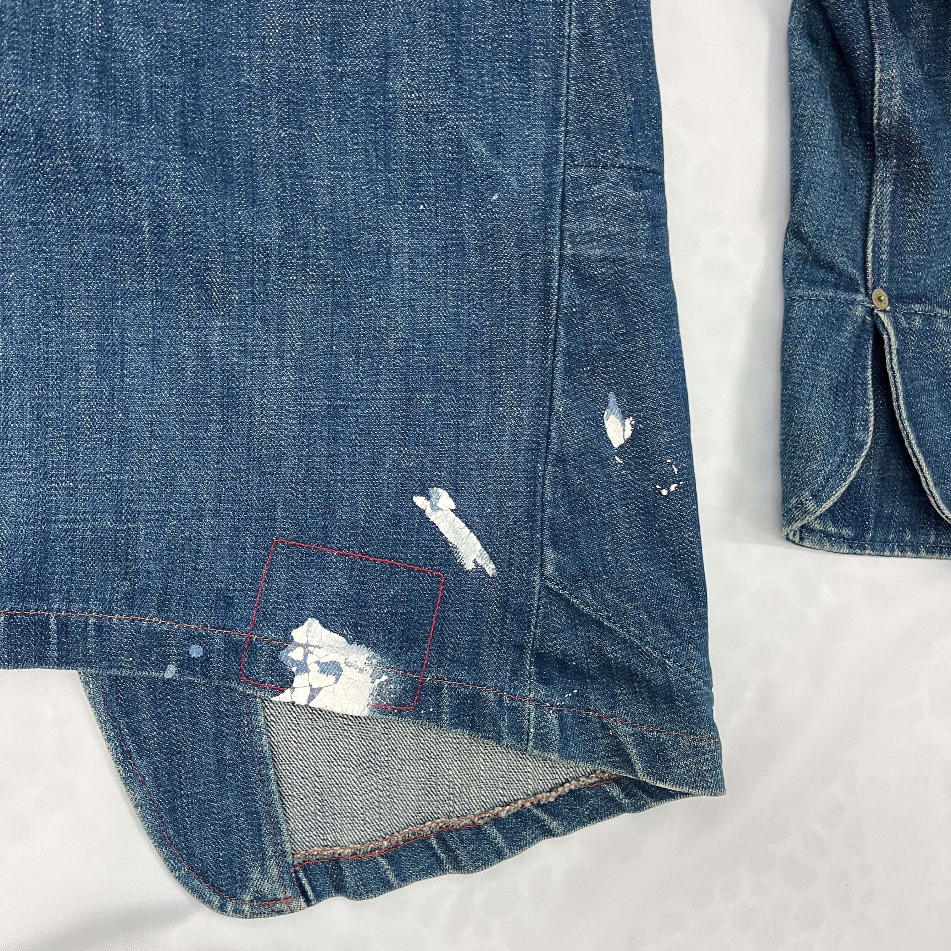 デニムのブルーに白のペンキが非常に良く映え、まるで初めから計算されたペイント加工や、リアルなワークウェアのような「アート感・グランジ感」を醸し出しています。一点物のオーラをお求めの方に最適です。