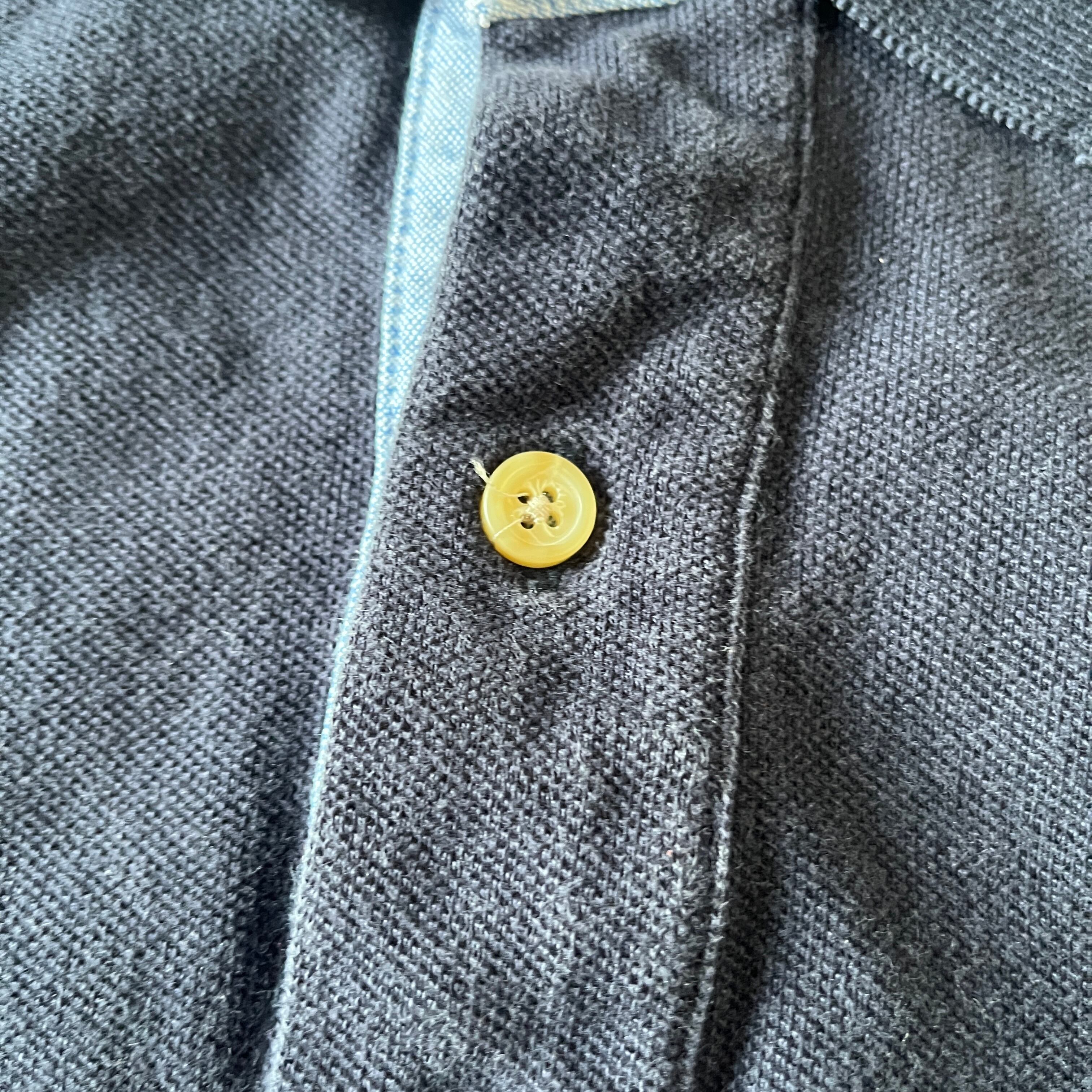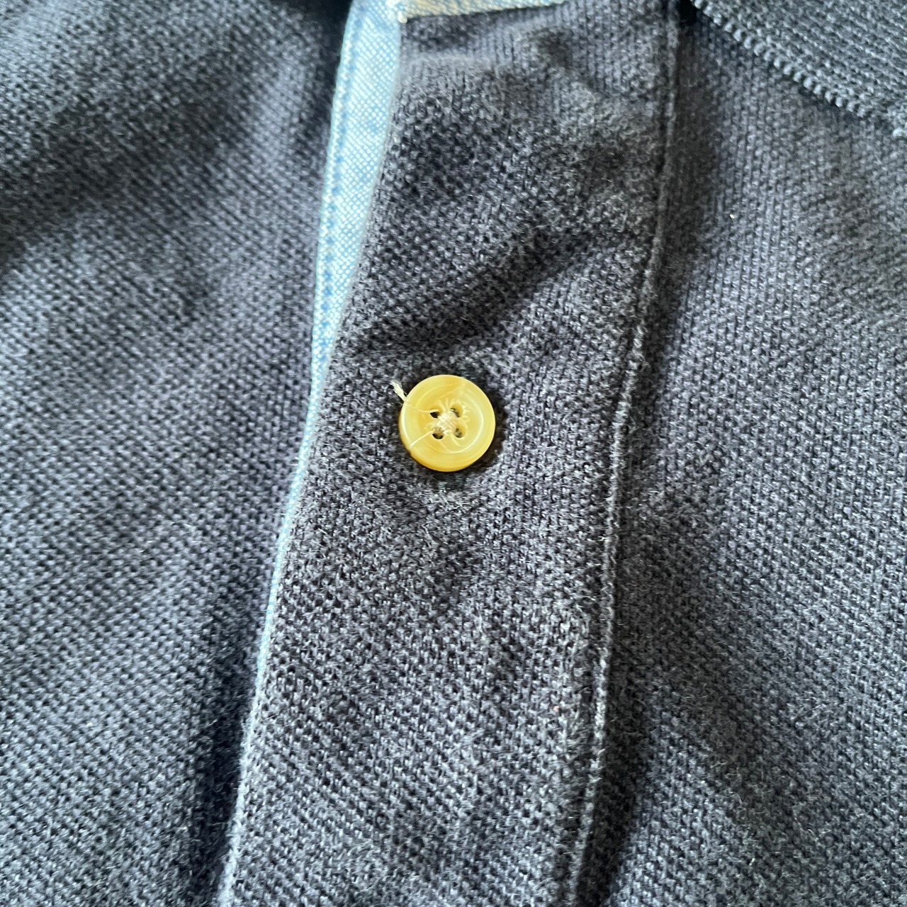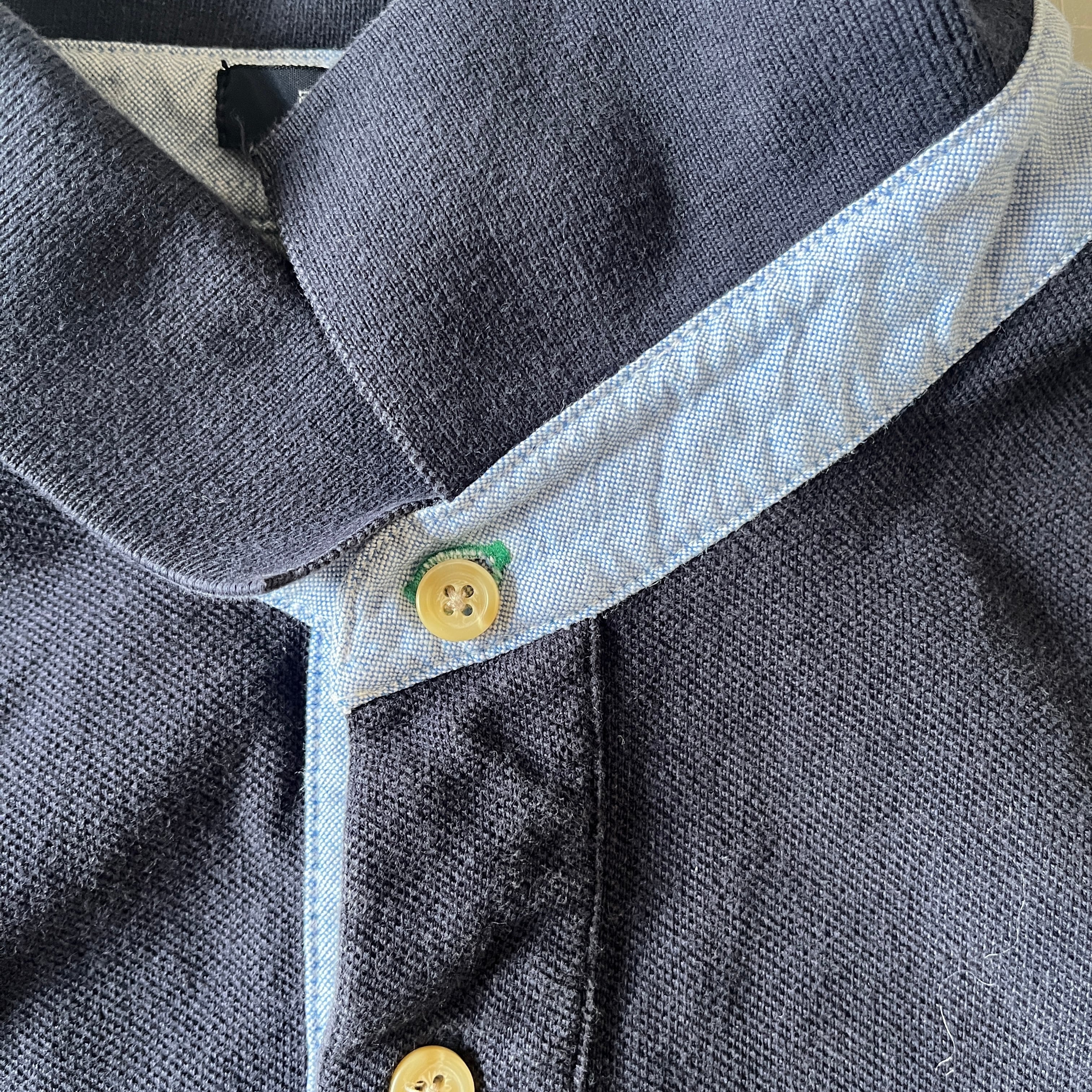 一見シンプルなネイビーのポロシャツですが、台襟のに「水色のオックスフォード生地」が切り替えられています。襟を立てたりボタンを開けた際にさりげなく見えるこの仕様が、清潔感と洒落感を一気に引き立ててくれます。